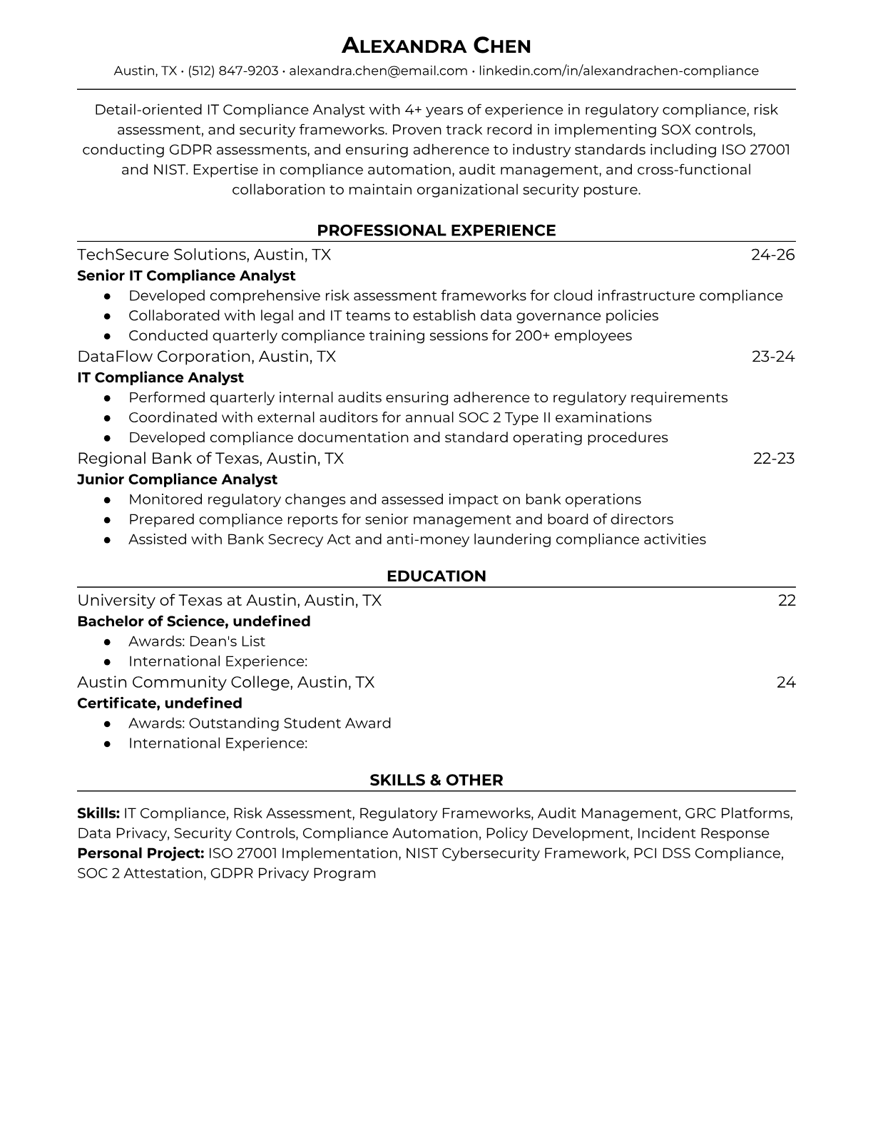 IT Compliance Analyst Resume Templates - ATS-Optimized