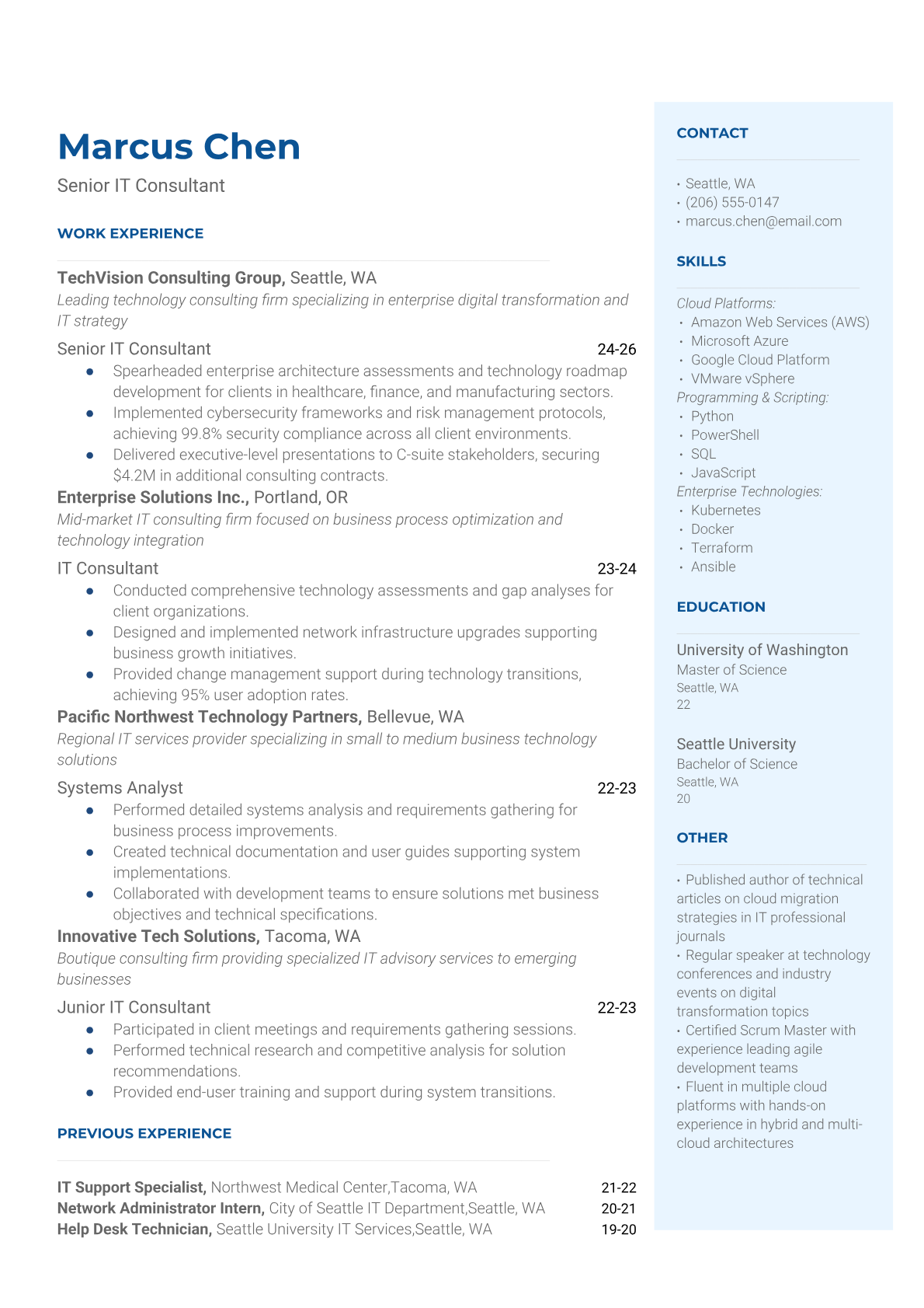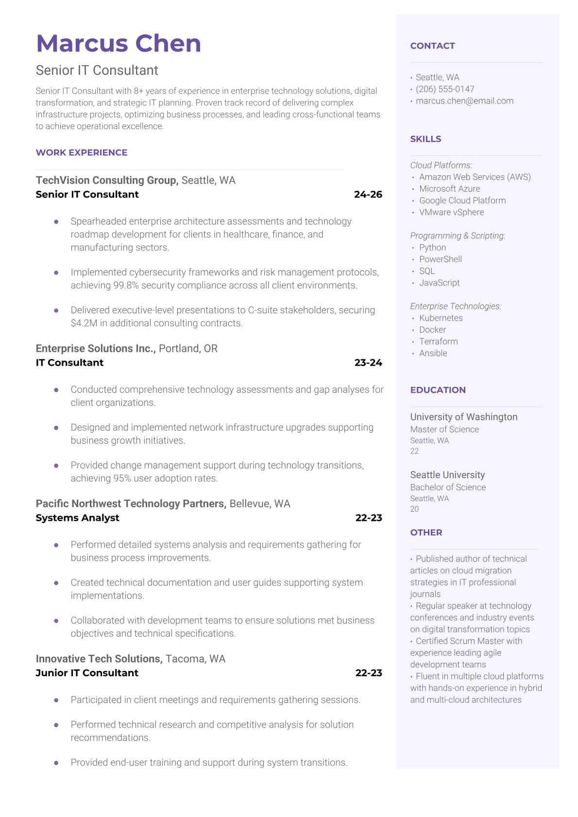 Professional IT Consultant resume templates optimized for consulting firms and enterprise clients. Choose from multiple ATS-friendly formats designed for technical consultants, solution architects, and digital transformation specialists.