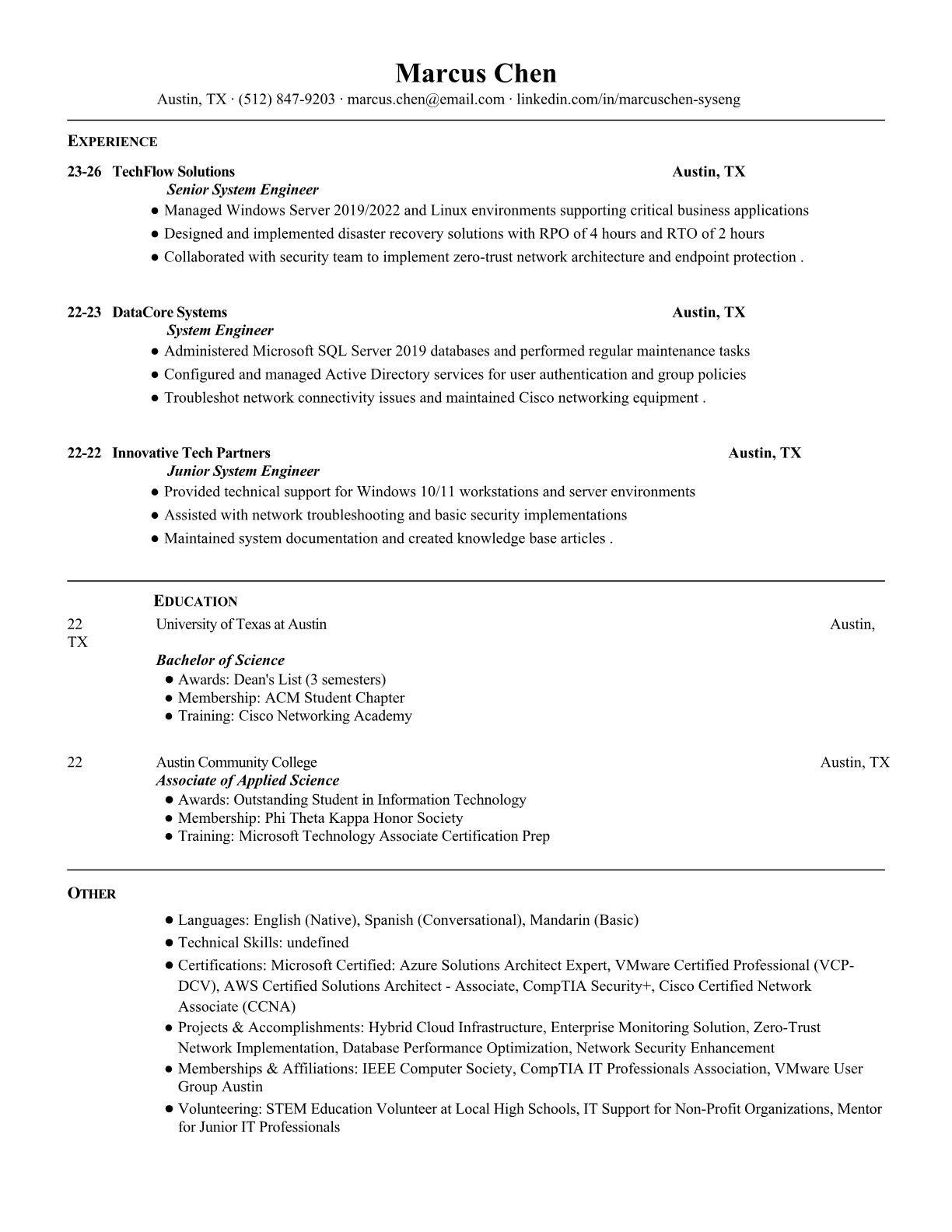 Professional IT System Engineer resume templates optimized for ATS systems. Highlight your infrastructure, cloud, and networking expertise with industry-specific keywords and technical certifications.