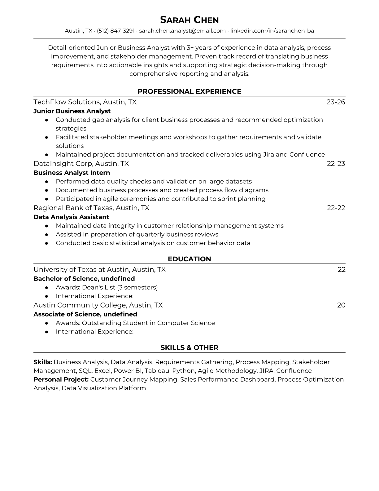 Junior Business Analyst Resume Templates - ATS-Optimized