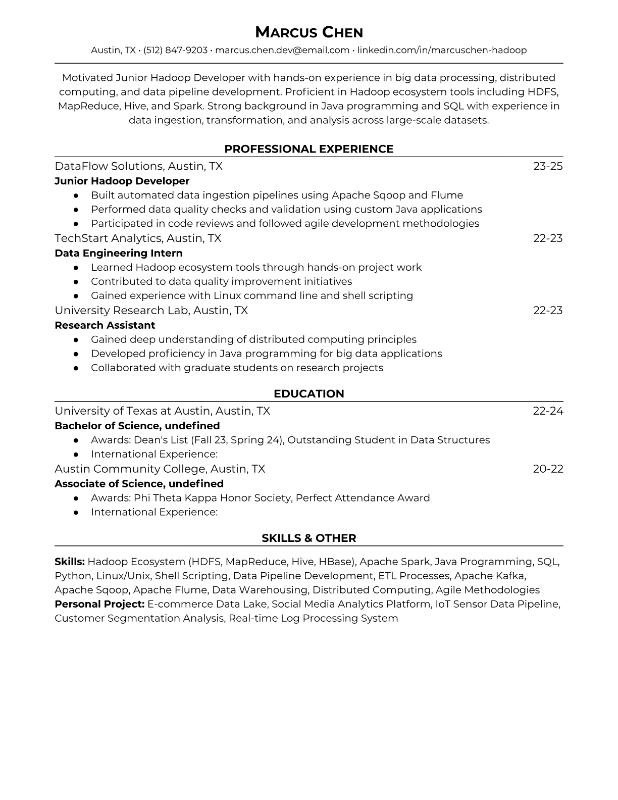 Junior Hadoop Developer Resume Templates - ATS-Optimized