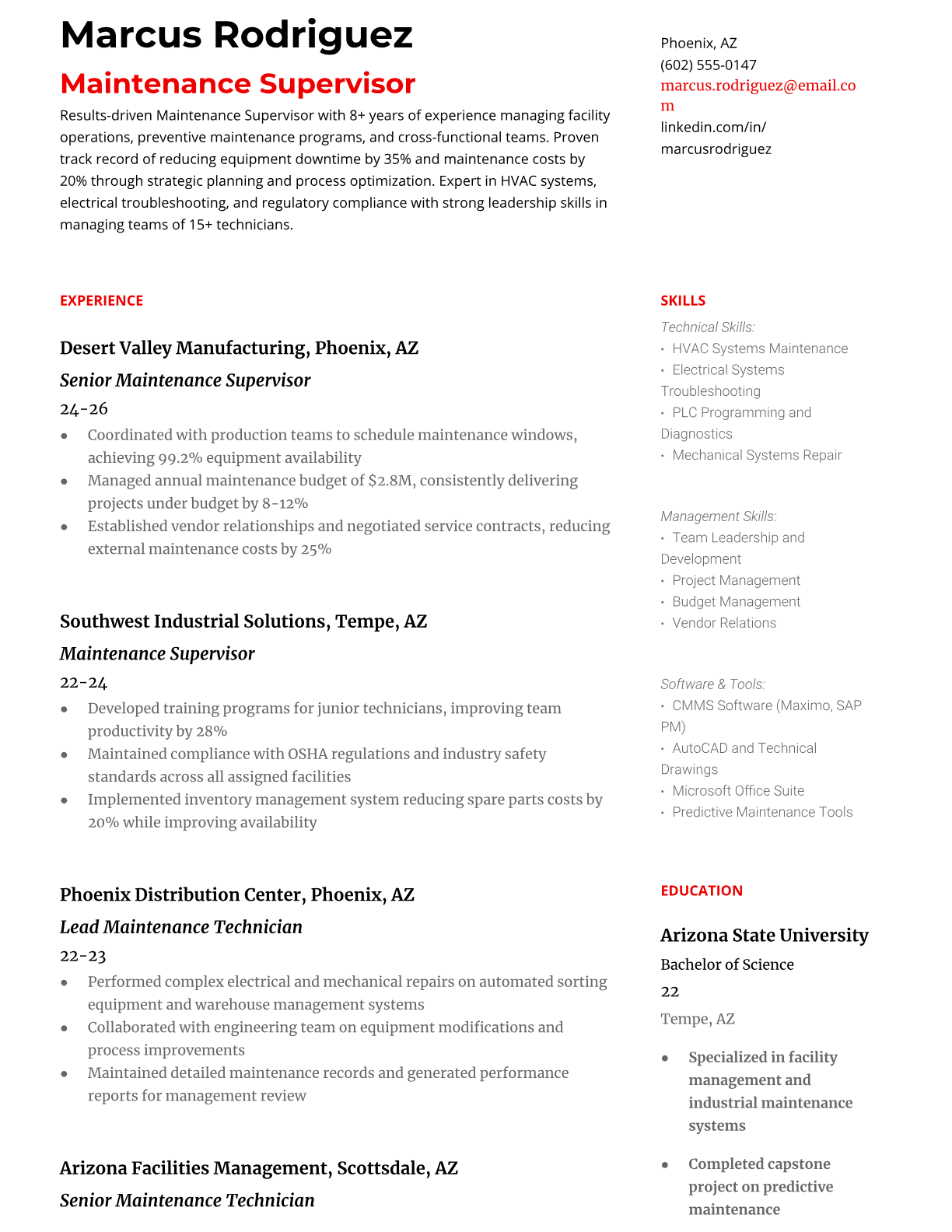 Maintenance Supervisor Resume Templates - ATS-Optimized