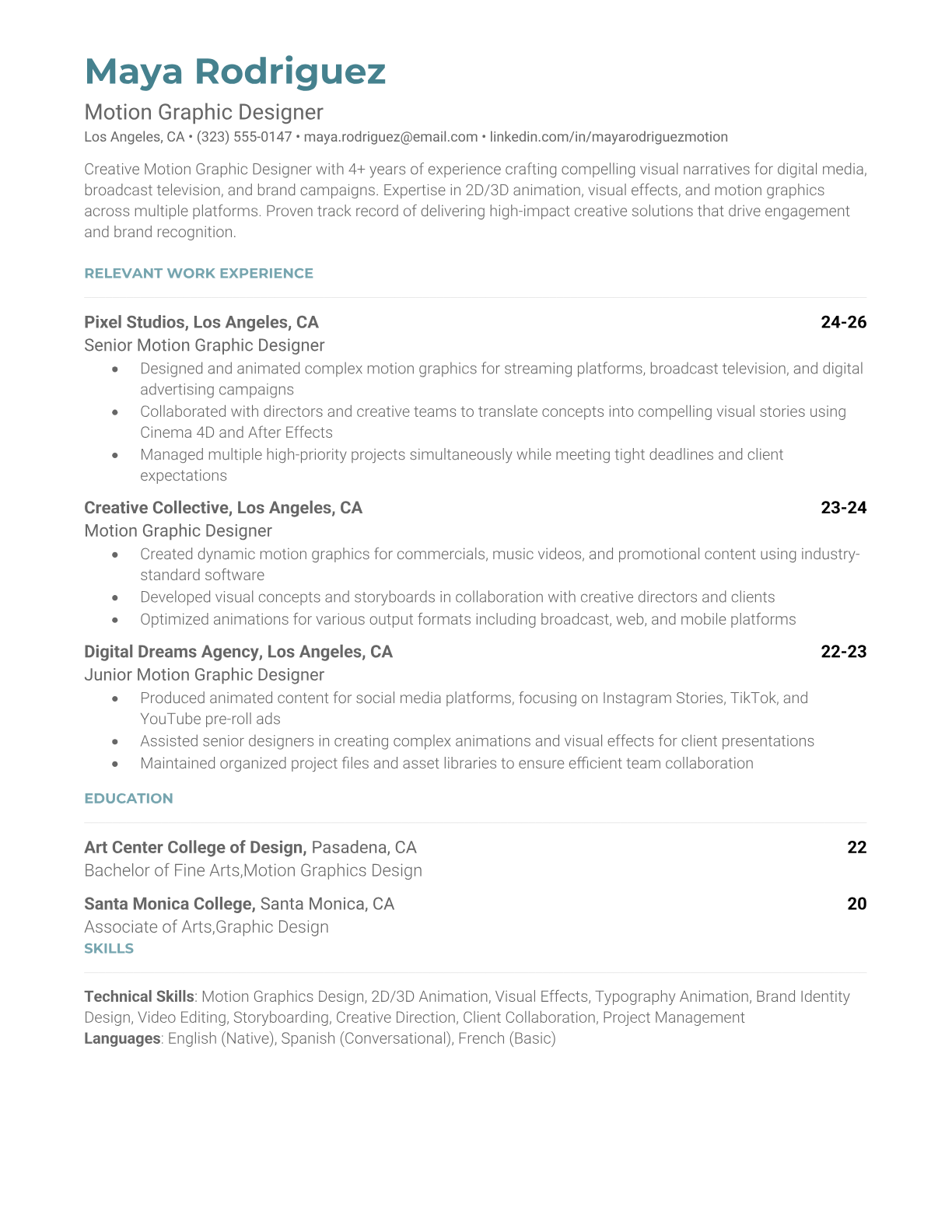 Professional motion graphic designer resume templates optimized for creative agencies and media companies. Showcase your animation projects, After Effects skills, and visual storytelling expertise with ATS-friendly formatting.