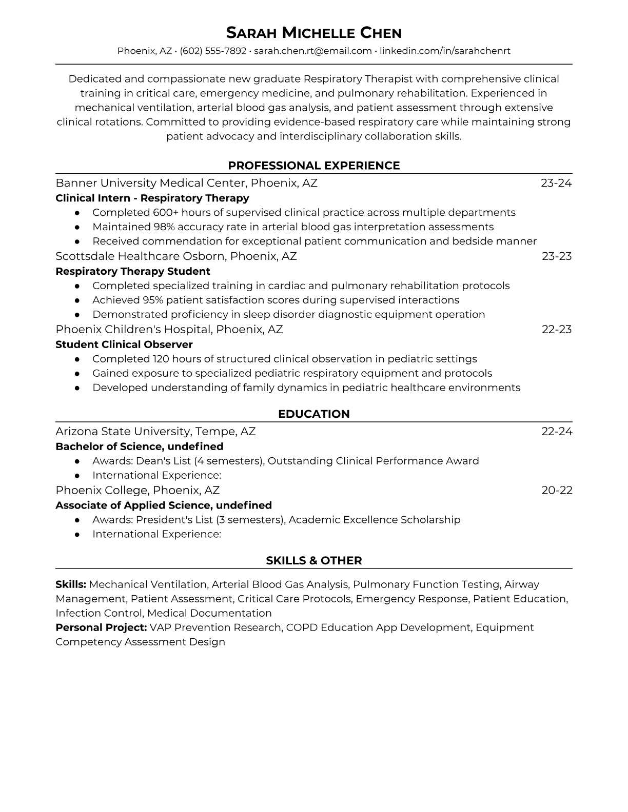 New Grad Respiratory Therapist Resume Templates - Healthcare ATS Optimized