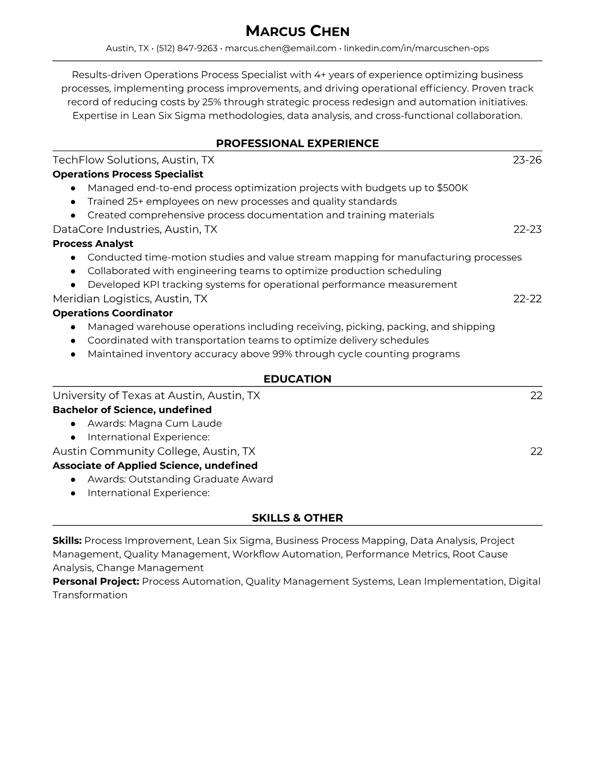 Professional Operations Process Specialist resume templates optimized for ATS systems. Highlight your process improvement skills, Lean Six Sigma experience, and quantifiable operational achievements.