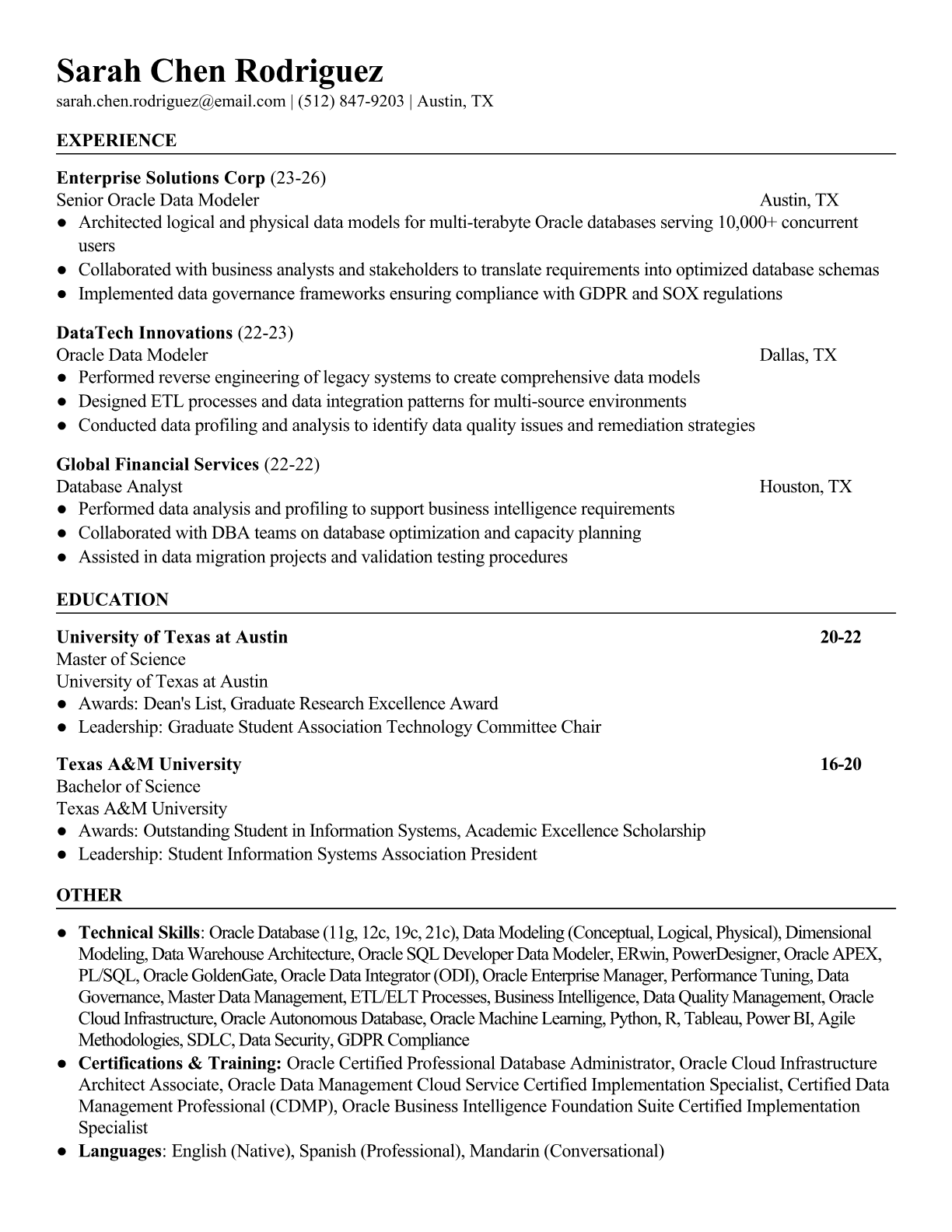 Professional Oracle Data Modeler resume templates optimized for ATS systems. Highlight your Oracle database expertise, data modeling tools, and certifications with templates used by senior data professionals.