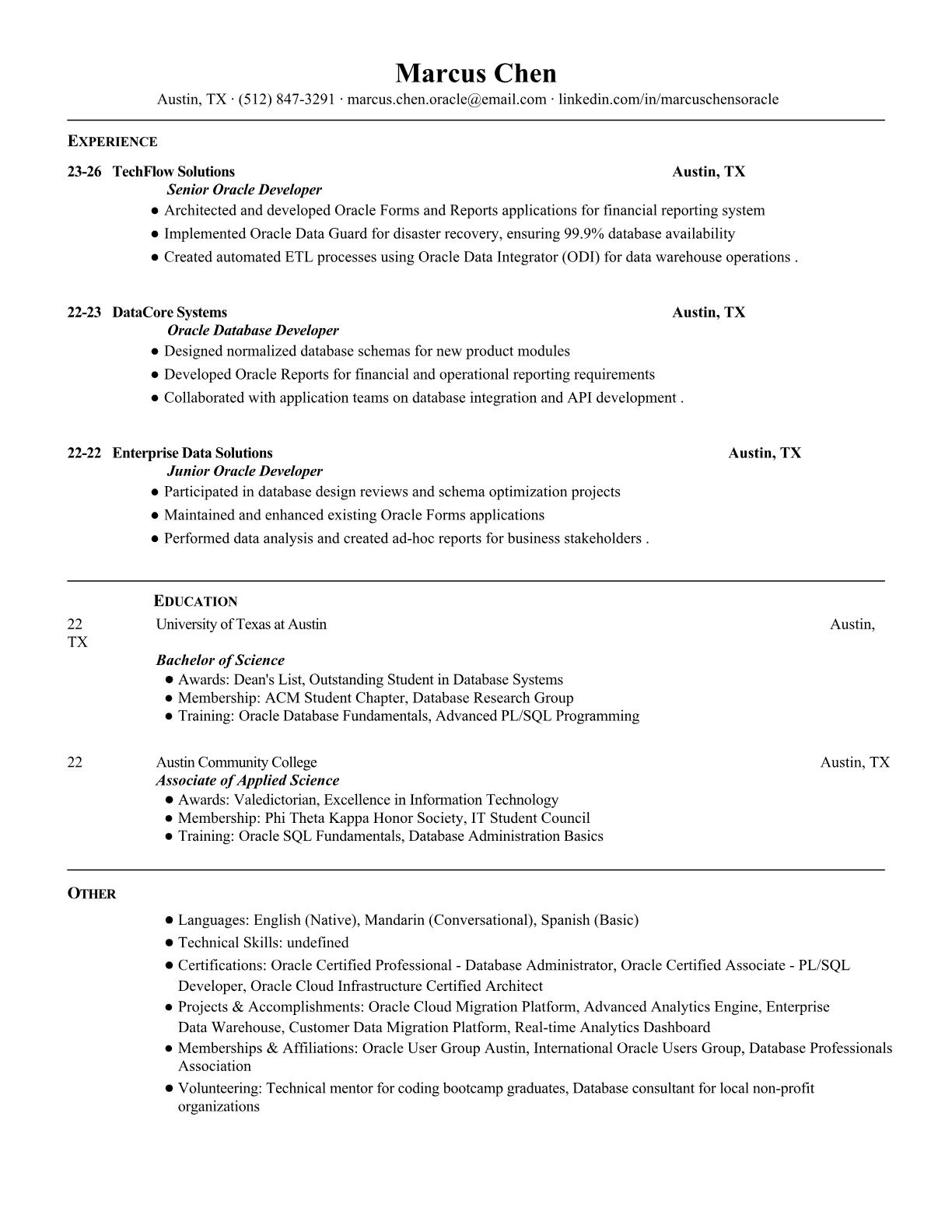 Professional Oracle Developer resume templates optimized for ATS systems. Includes PL/SQL, Oracle Database, and certification keywords that get past automated screening.