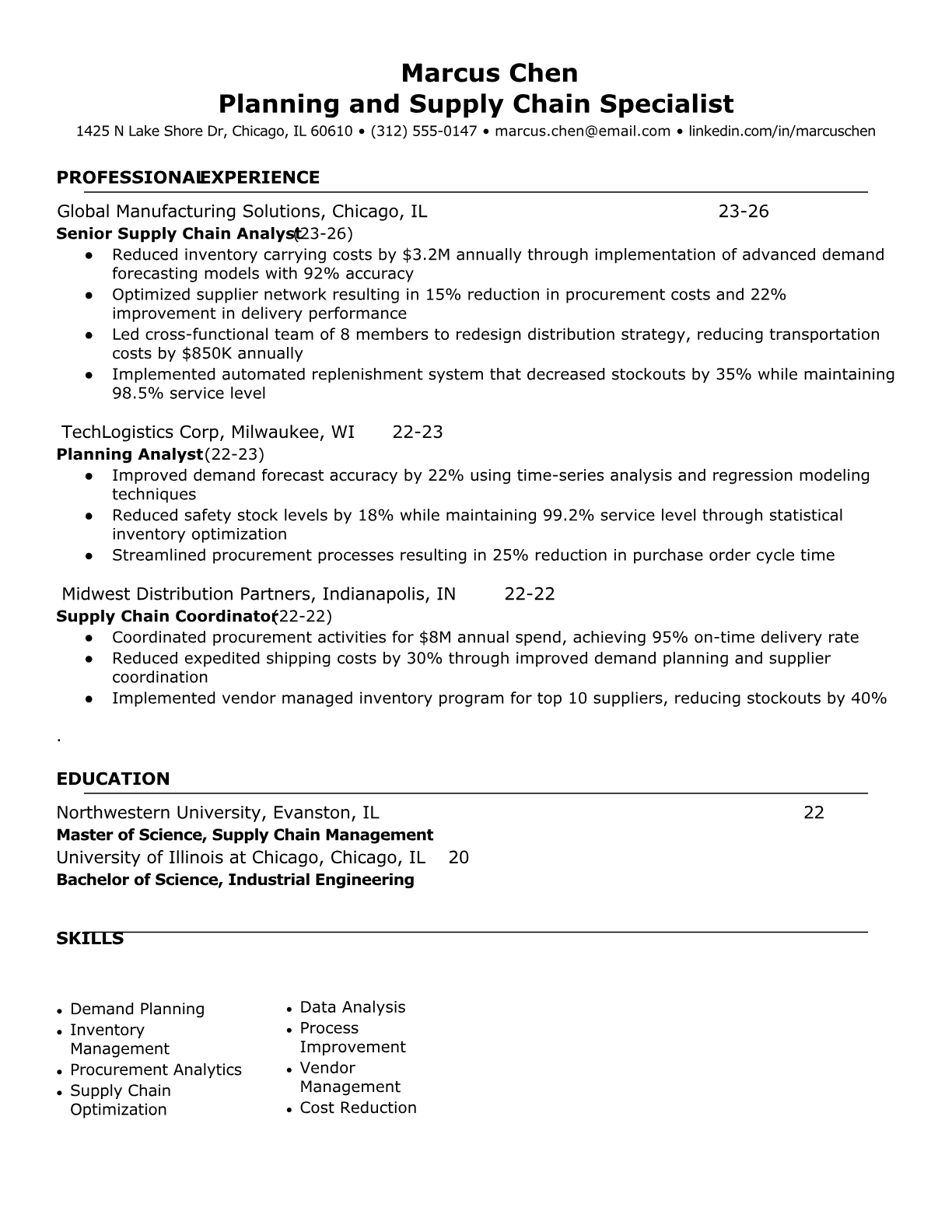 Professional resume templates for Planning and Supply Chain Specialists. ATS-friendly formats with supply chain keywords, demand planning skills, and logistics experience. Used by specialists at top manufacturing and retail companies.