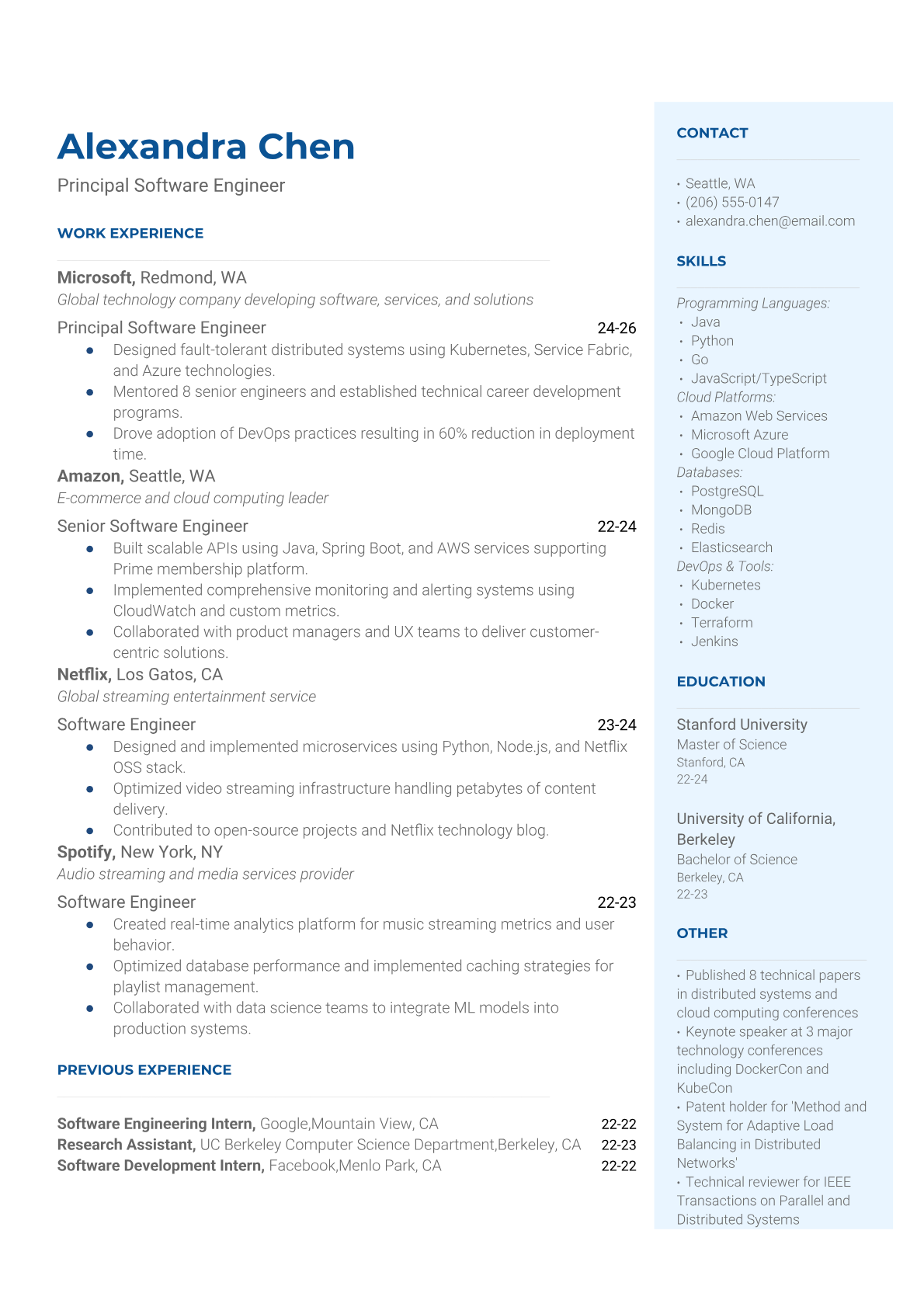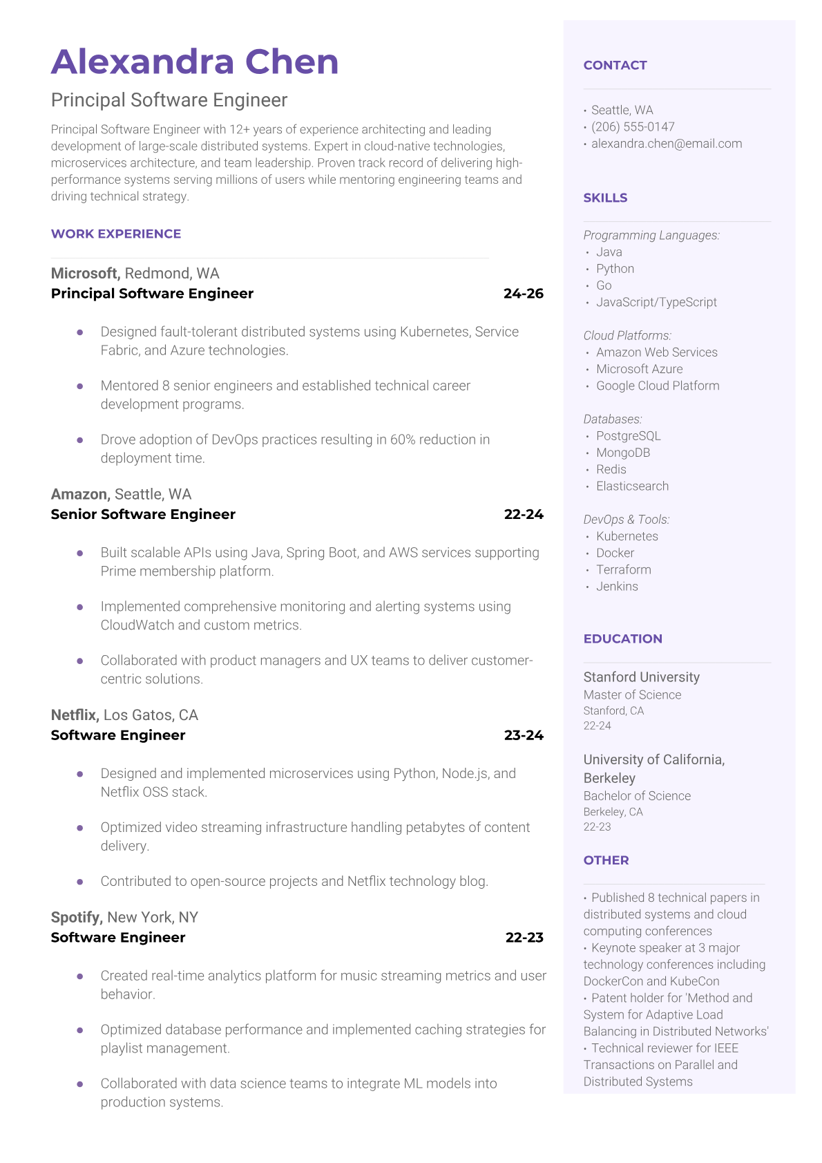 Professional Principal Software Engineer resume templates designed for senior technical leadership roles. Highlight your system architecture experience and technical leadership skills with ATS-friendly formatting.