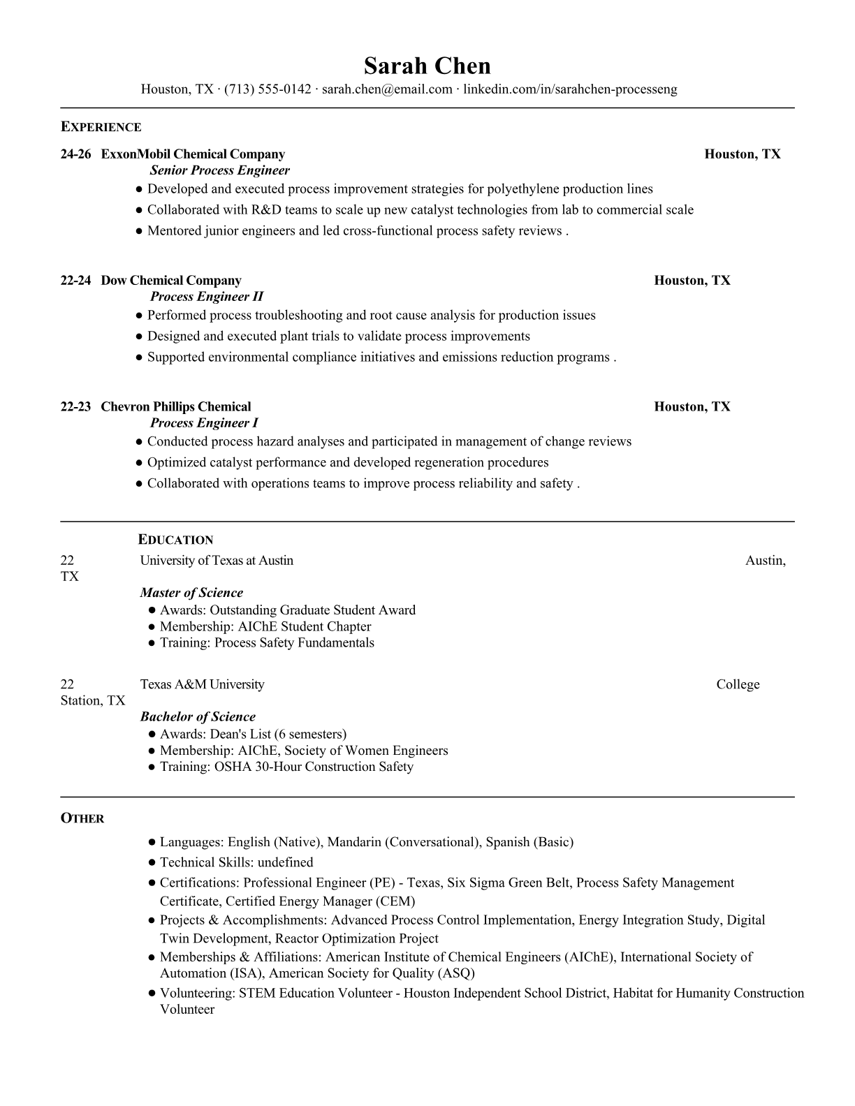 Professional Process Engineer resume templates optimized for manufacturing and engineering ATS systems. Includes technical skills, process optimization keywords, and industry-specific formatting.
