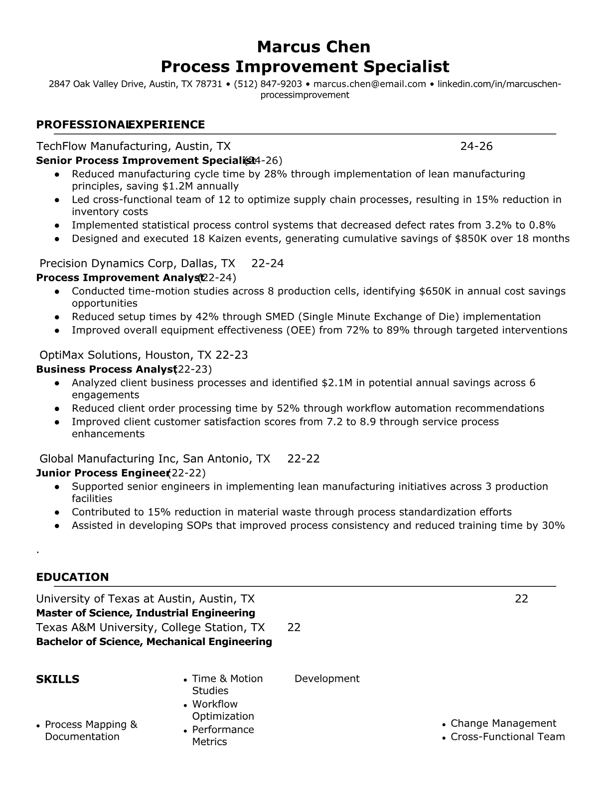 Professional Process Improvement Specialist resume templates optimized for ATS systems. Highlight Lean Six Sigma skills, quantifiable results, and process optimization achievements.
