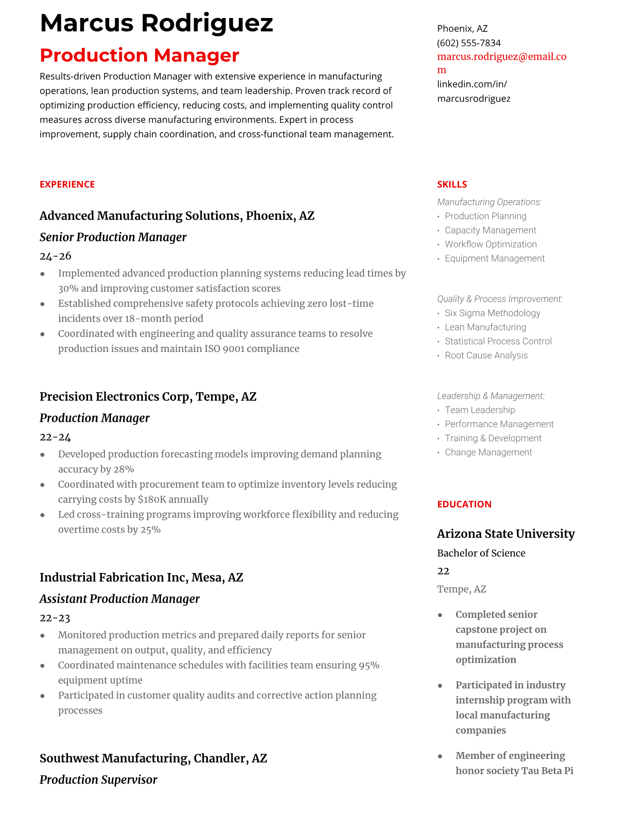 Professional Production Manager resume templates optimized for manufacturing ATS systems. Includes lean manufacturing, Six Sigma, and production planning keywords. Used by managers at top manufacturing companies.