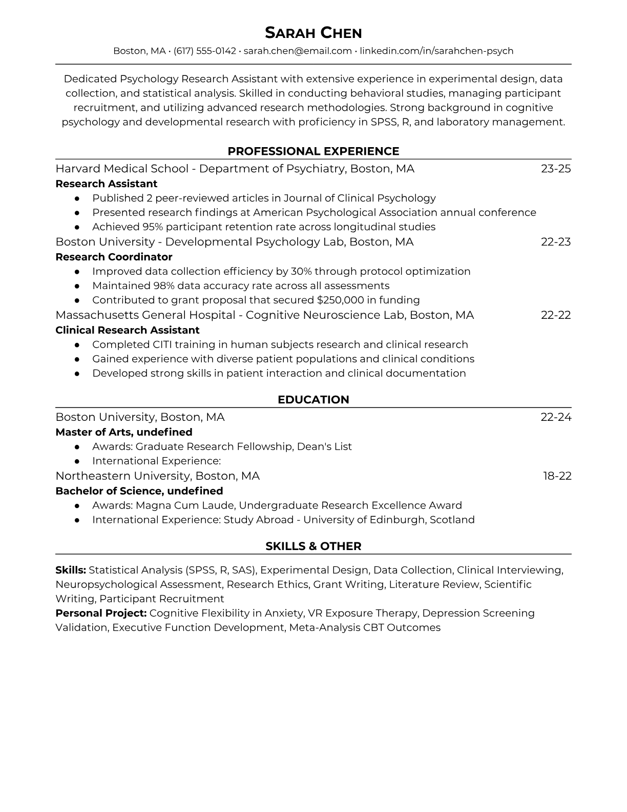 Psychology Research Assistant Resume Templates - Multiple Formats