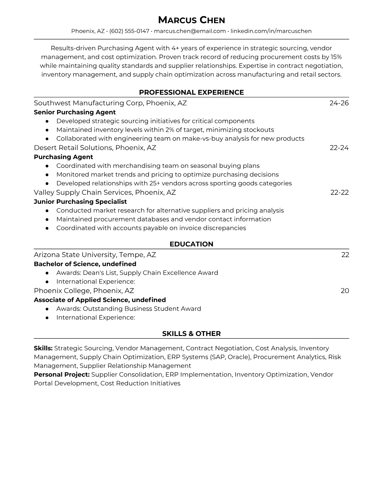 Professional Purchasing Agent resume templates optimized for ATS systems. Includes procurement keywords, vendor management experience, and contract negotiation skills to help you land interviews.