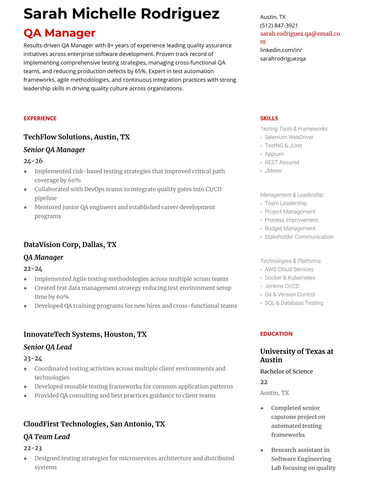 Professional QA Manager resume templates highlighting testing expertise and team leadership. Optimized for ATS systems with quality assurance keywords and management achievements.