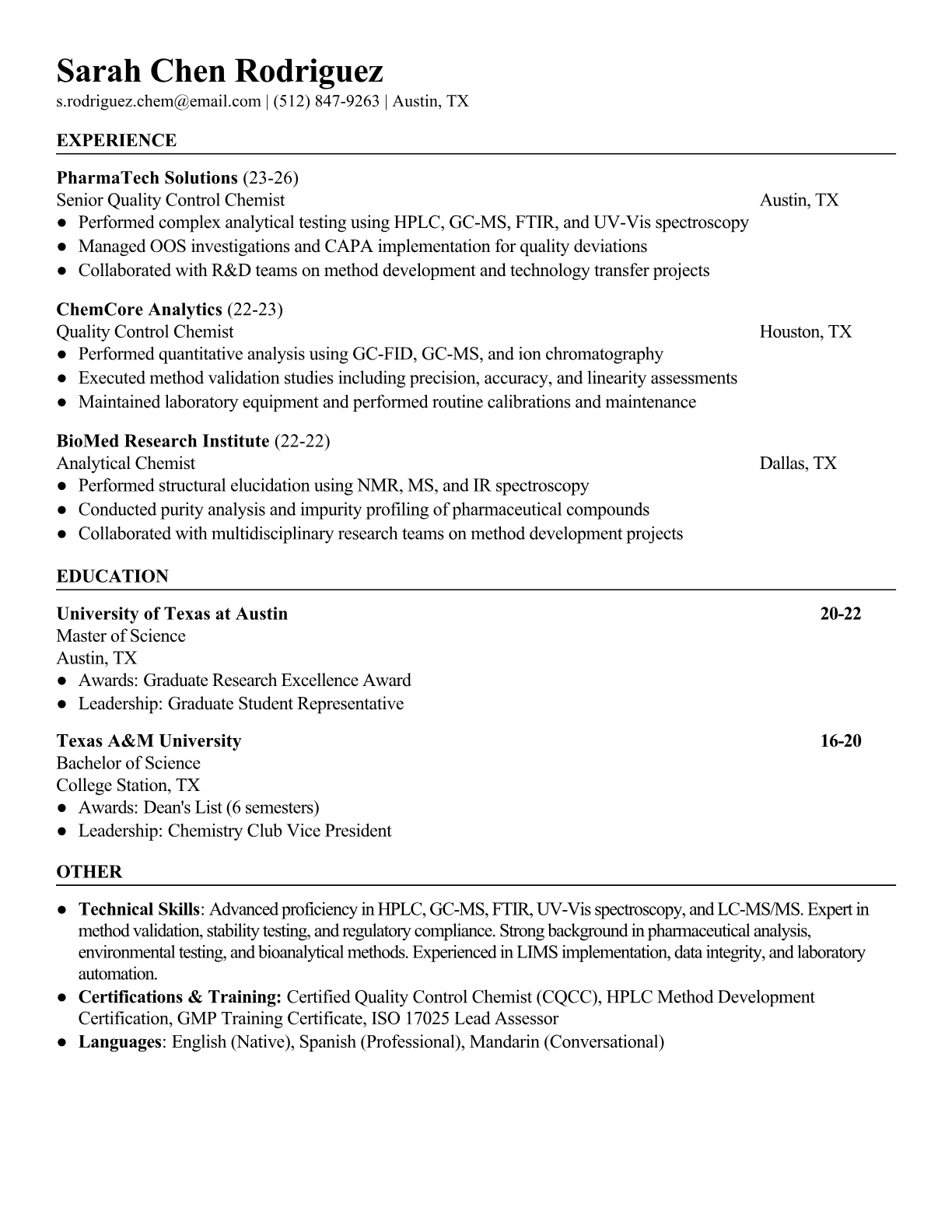 Professional Quality Control Chemist resume templates optimized for pharmaceutical and manufacturing ATS systems. Includes analytical chemistry keywords, regulatory compliance terms, and industry-specific formatting.