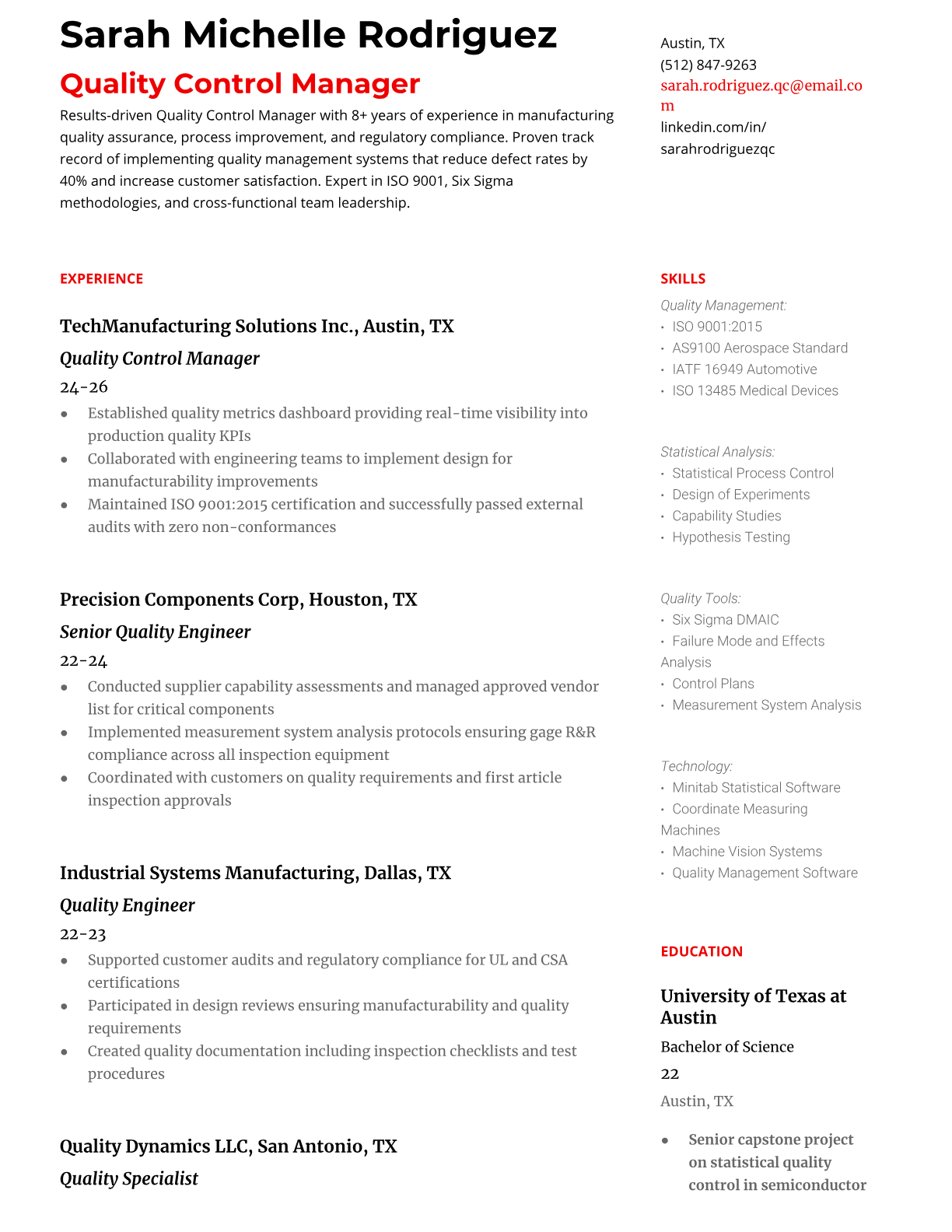 Quality Control Manager Resume Templates - ATS-Optimized