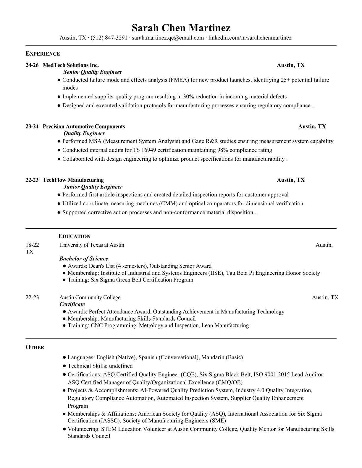 Quality Engineer Resume Templates - Professional & Technical Formats