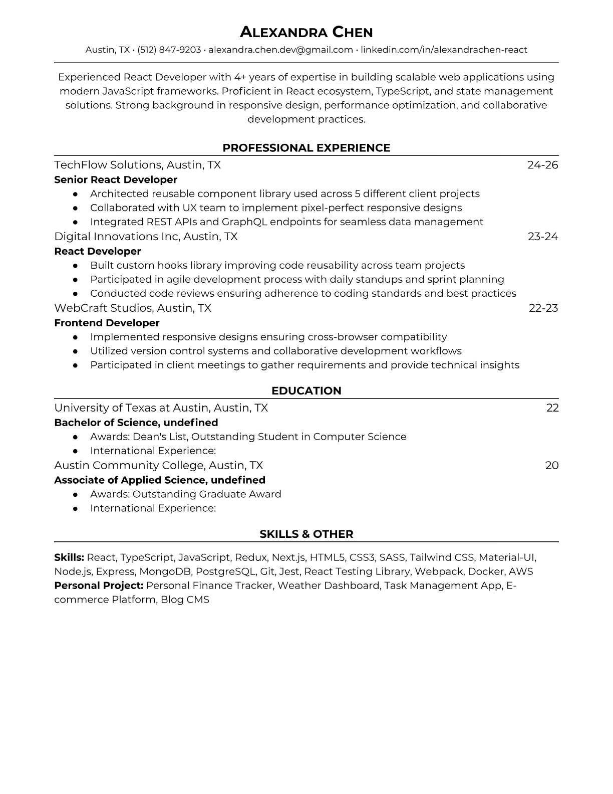 React Developer RESUME TEMPLATES
