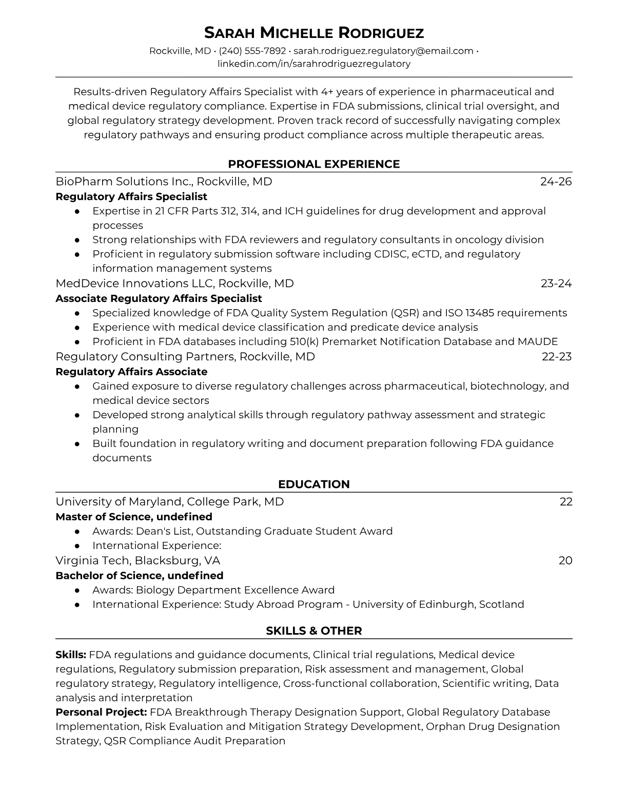 Regulatory Affairs Specialist Resume Templates - ATS-Optimized
