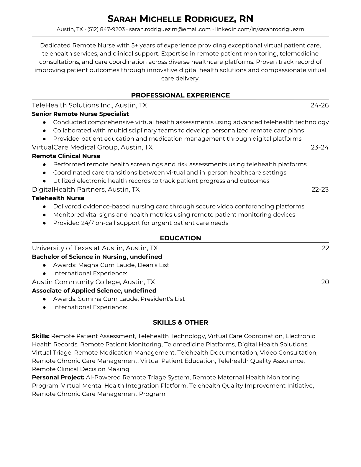 Professional Remote Nurse resume templates optimized for telehealth and virtual care positions. Includes keywords for RN roles, telehealth platforms, and remote patient monitoring systems.