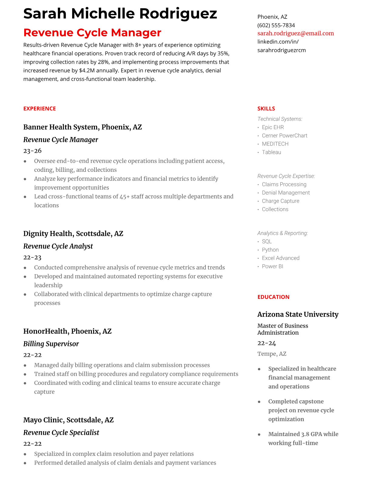 Professional Revenue Cycle Manager resume templates optimized for healthcare ATS systems. Includes Epic, Cerner, and RCM keywords for billing operations and financial management roles.