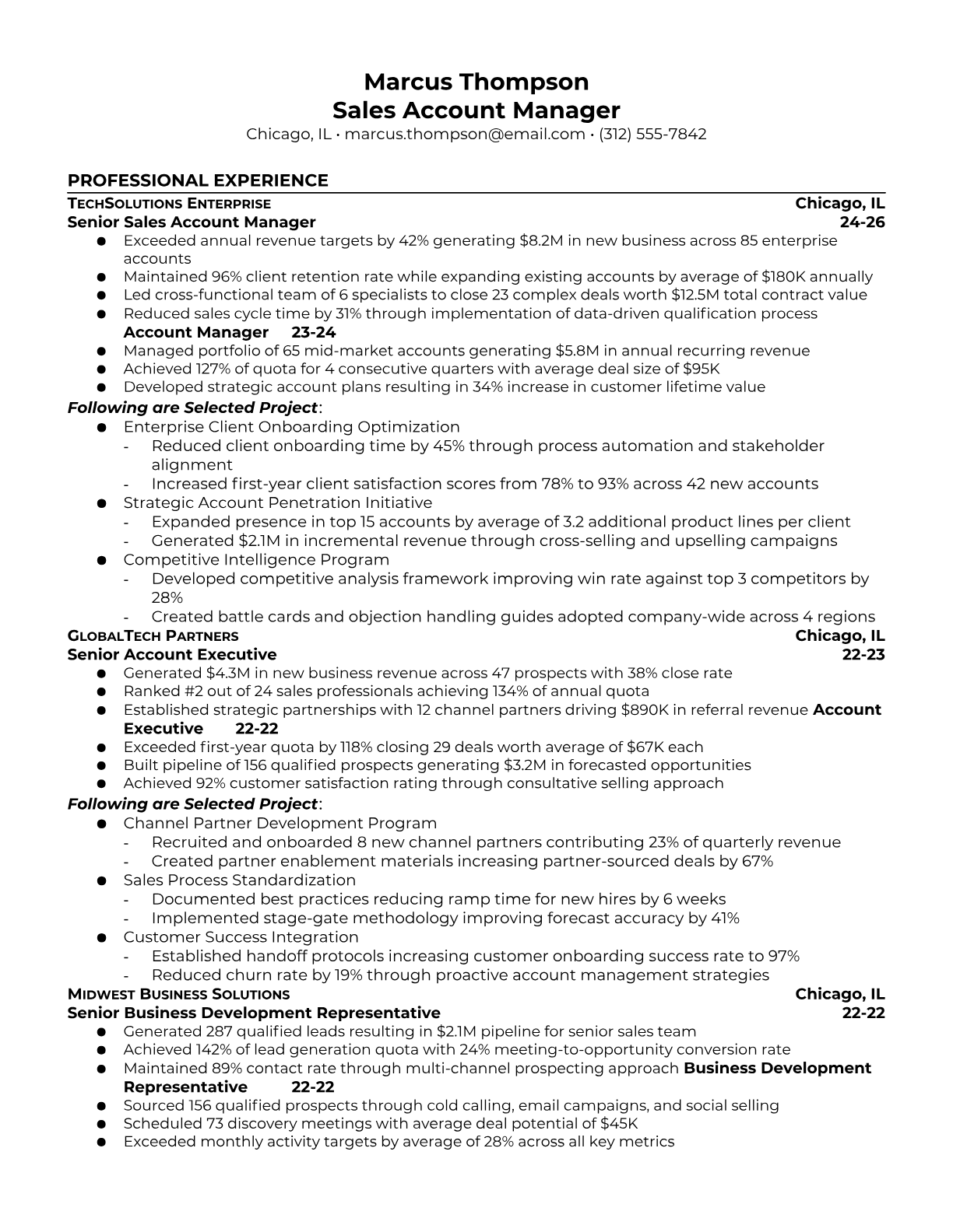 Professional Sales Account Manager resume templates optimized for ATS systems. Highlight your revenue achievements, CRM skills, and client relationship management experience with our proven templates.