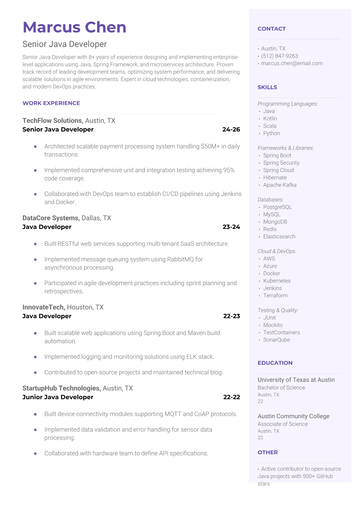 Professional Senior Java Developer resume templates optimized for ATS systems. Highlight your Java expertise, Spring Framework experience, and technical leadership skills.
