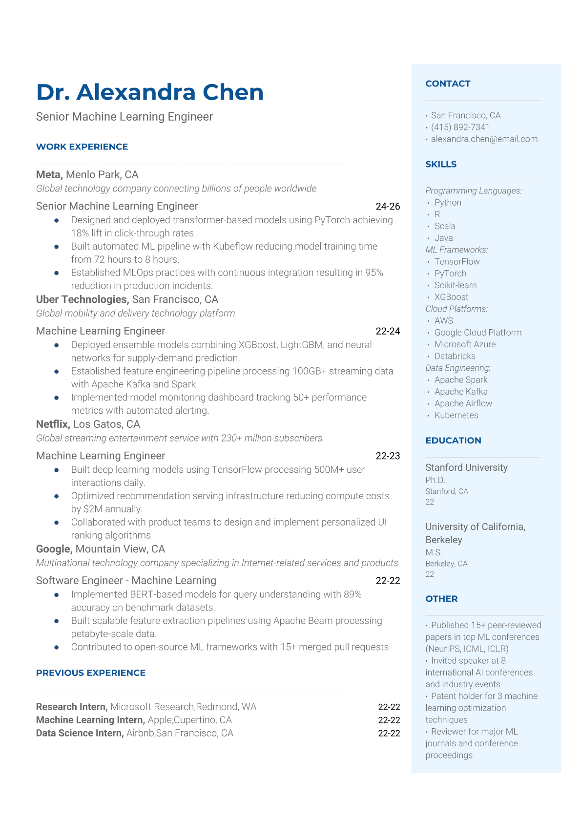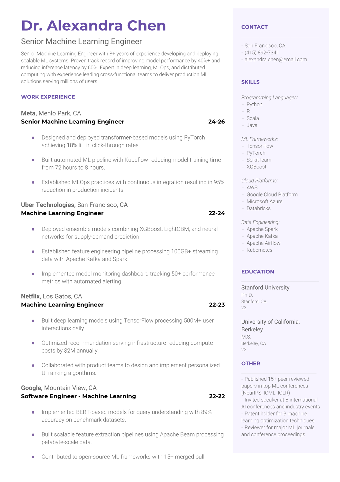 Professional Senior ML Engineer resume templates optimized for tech company ATS systems. Highlight your ML expertise, leadership experience, and quantifiable impact with our specialized templates.