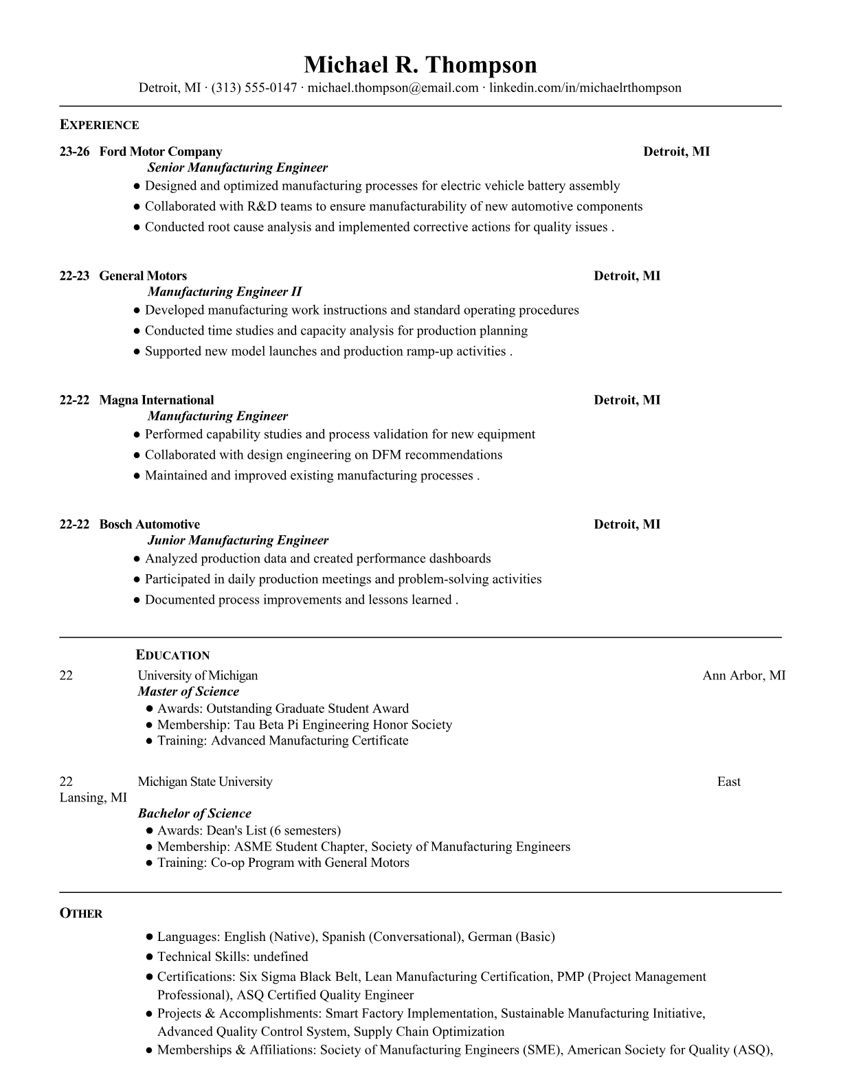 Senior Manufacturing Engineer Resume Templates - ATS Optimized