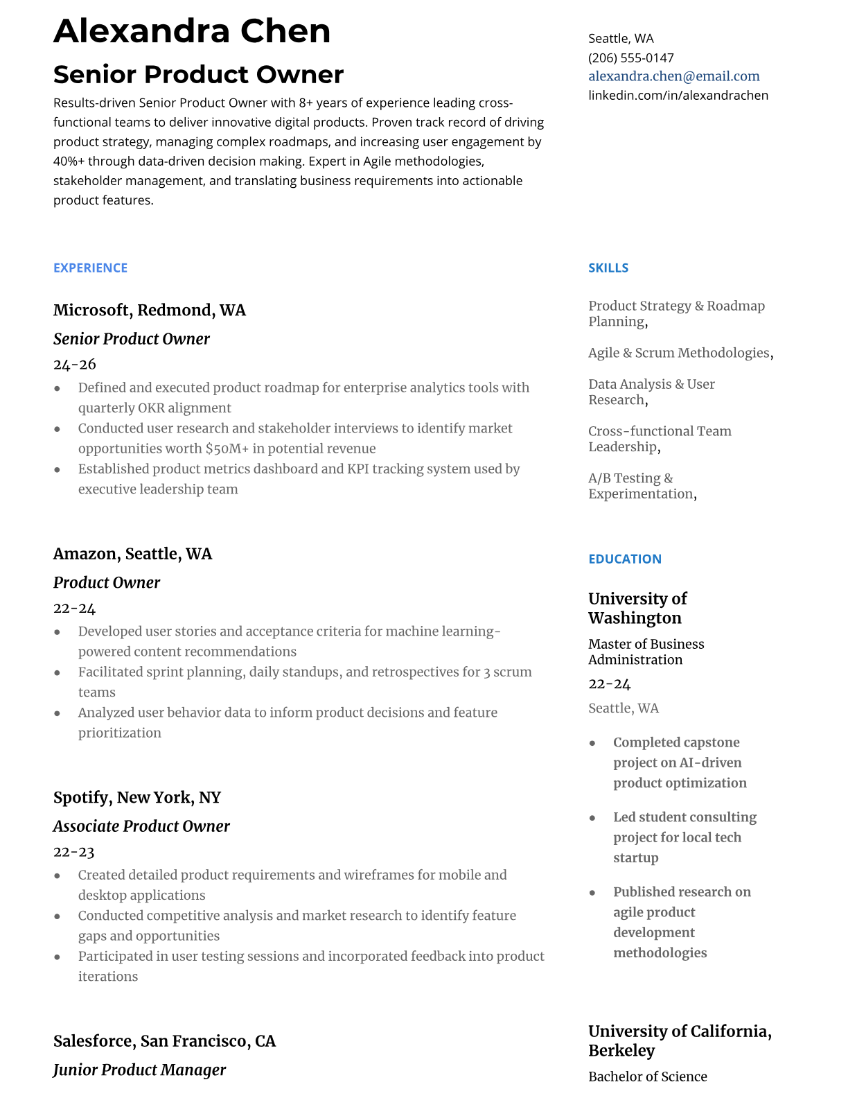 Professional Senior Product Owner resume templates optimized for ATS systems. Includes product management keywords, stakeholder management experience, and agile methodology expertise.