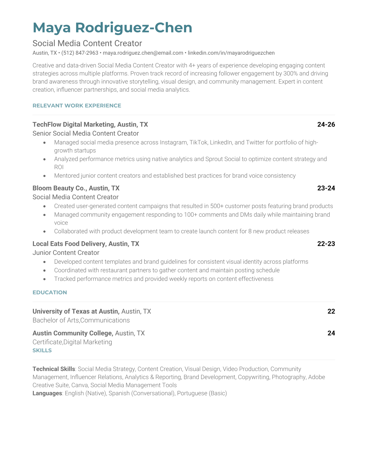 Professional Social Media Content Creator resume templates optimized for marketing agencies and brands. Includes social media keywords, portfolio sections, and campaign results formatting.