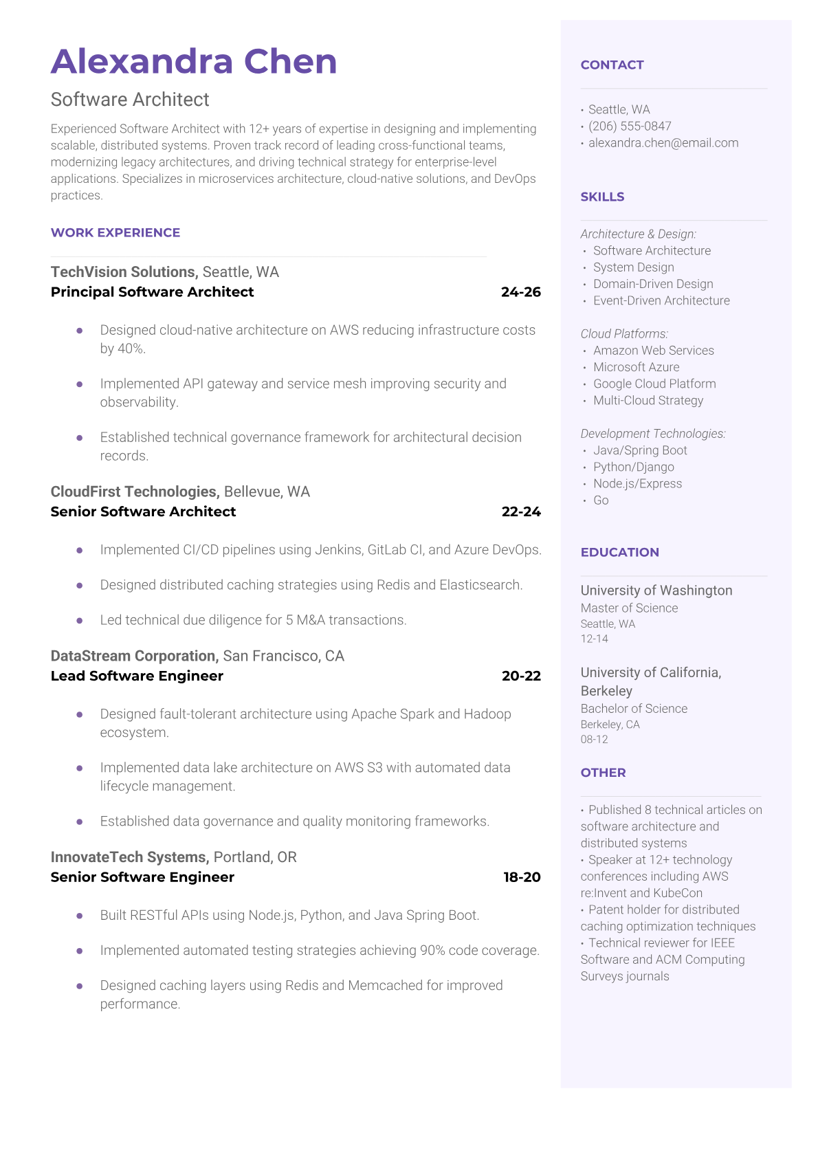 Professional Software Architect resume templates designed for senior technical roles. Optimized for ATS systems with architecture keywords, system design experience, and technical leadership highlights.