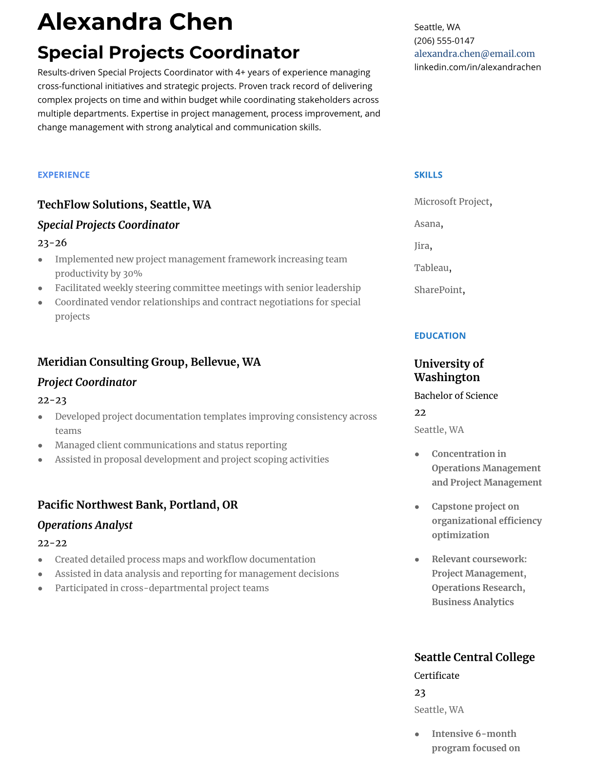 Professional Special Projects Coordinator resume templates optimized for ATS systems. Highlight project management skills, cross-functional coordination, and measurable outcomes. Used by coordinators at top companies.