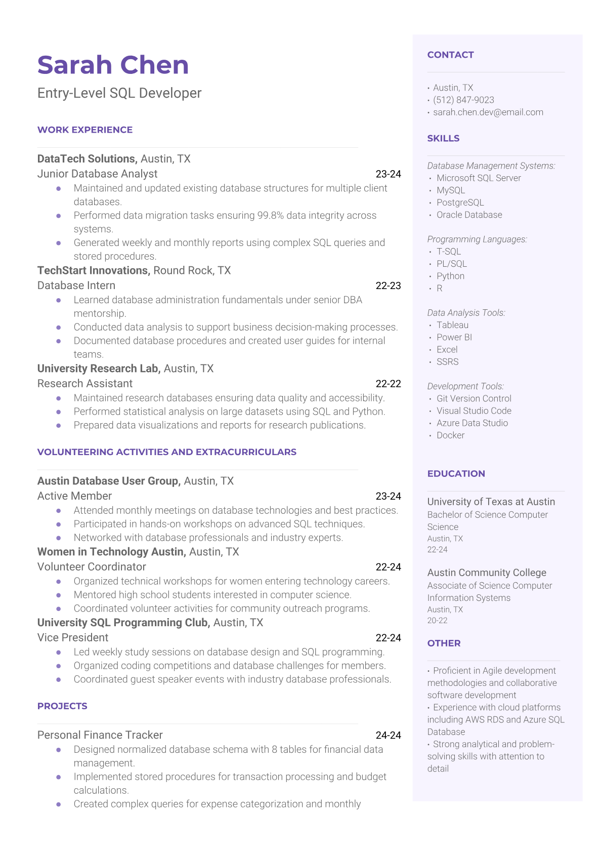 Entry-Level SQL Developer Resume Templates - ATS-Optimized