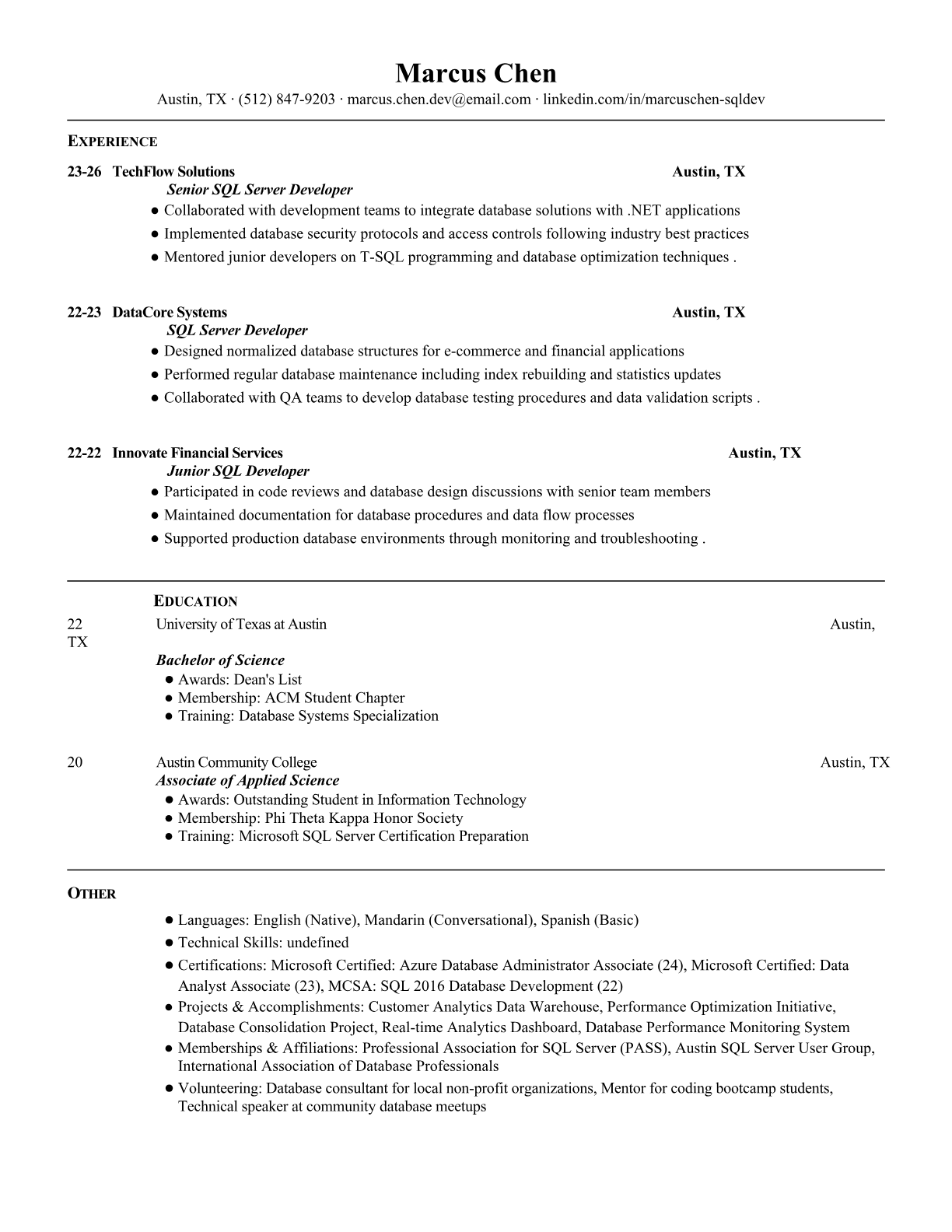 Professional SQL Server Developer resume templates optimized for ATS systems. Highlight T-SQL, SSIS, SSRS skills and database projects. Used by developers at top tech companies.