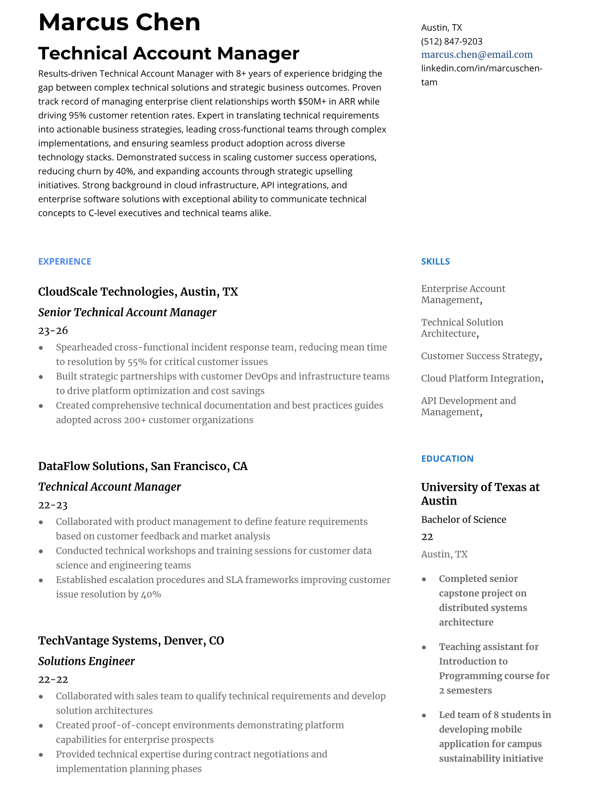 Professional Technical Account Manager resume templates optimized for ATS systems. Highlight your technical expertise and customer success experience with templates used by TAMs at leading tech companies.