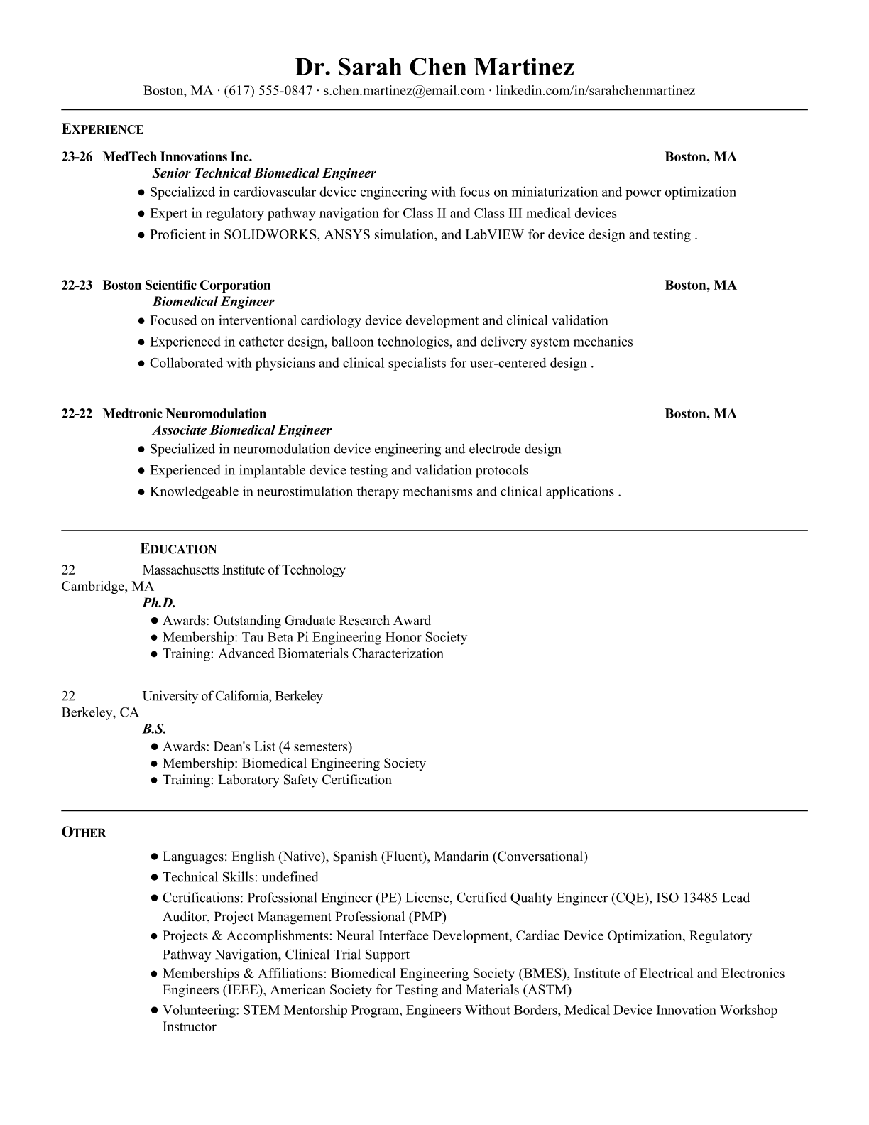 Professional resume templates for Technical Biomedical Engineers. Optimized for medical device companies with industry-specific keywords, FDA compliance experience, and technical certifications.