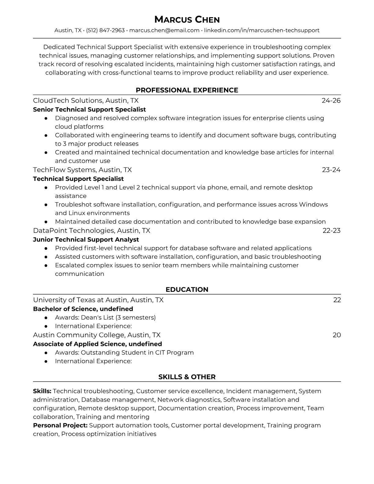 Technical Support Specialist Resume Templates , ATS-Optimized