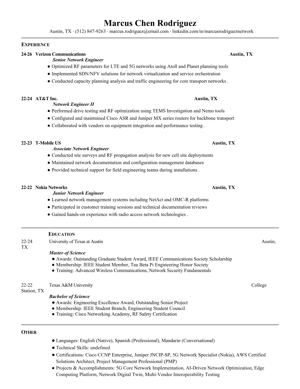 Professional telecom network engineer resume templates optimized for ATS systems. Includes technical keywords for 5G, RF, Cisco, and network protocols. Used by engineers at major telecom carriers.