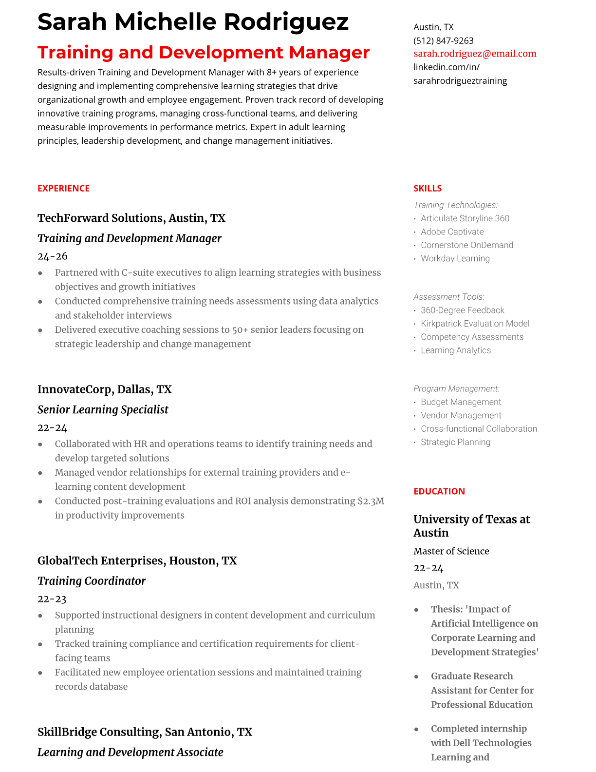 Professional Training and Development Manager resume templates optimized for ATS systems. Choose from progression-focused or narrative formats to highlight your L&D leadership experience and program management skills.