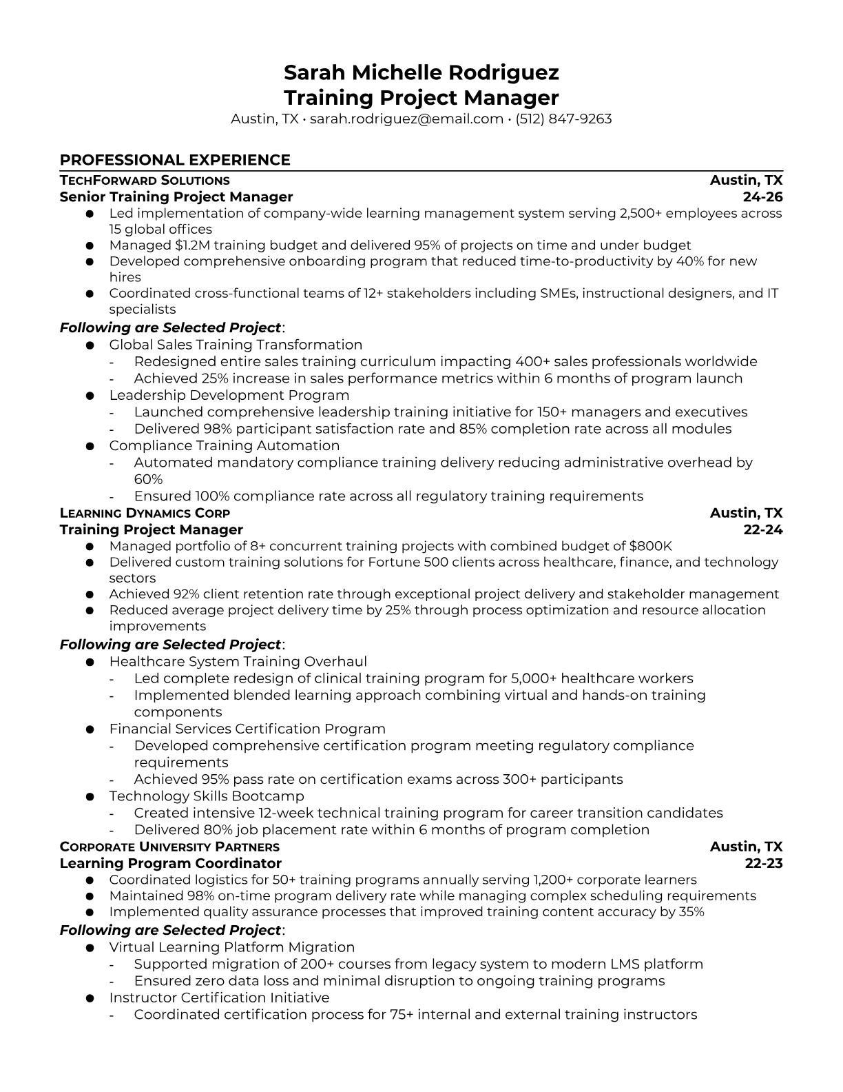 Professional Training Project Manager resume templates optimized for corporate ATS systems. Highlight your project management skills, L&D expertise, and training program leadership experience.