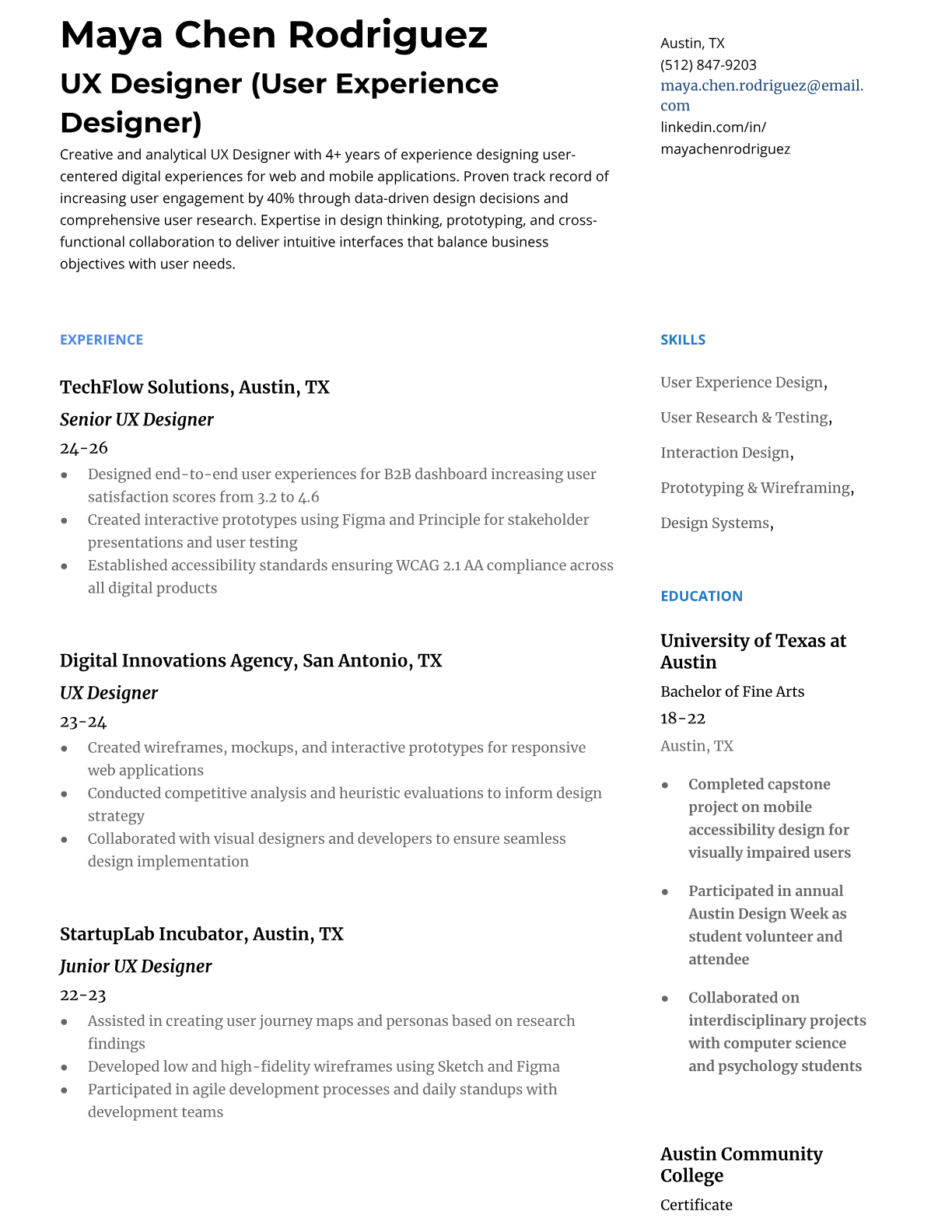 Professional UX Designer resume templates optimized for design agencies and tech companies. Highlight your portfolio projects, design tools, and user research experience with ATS-friendly formatting.