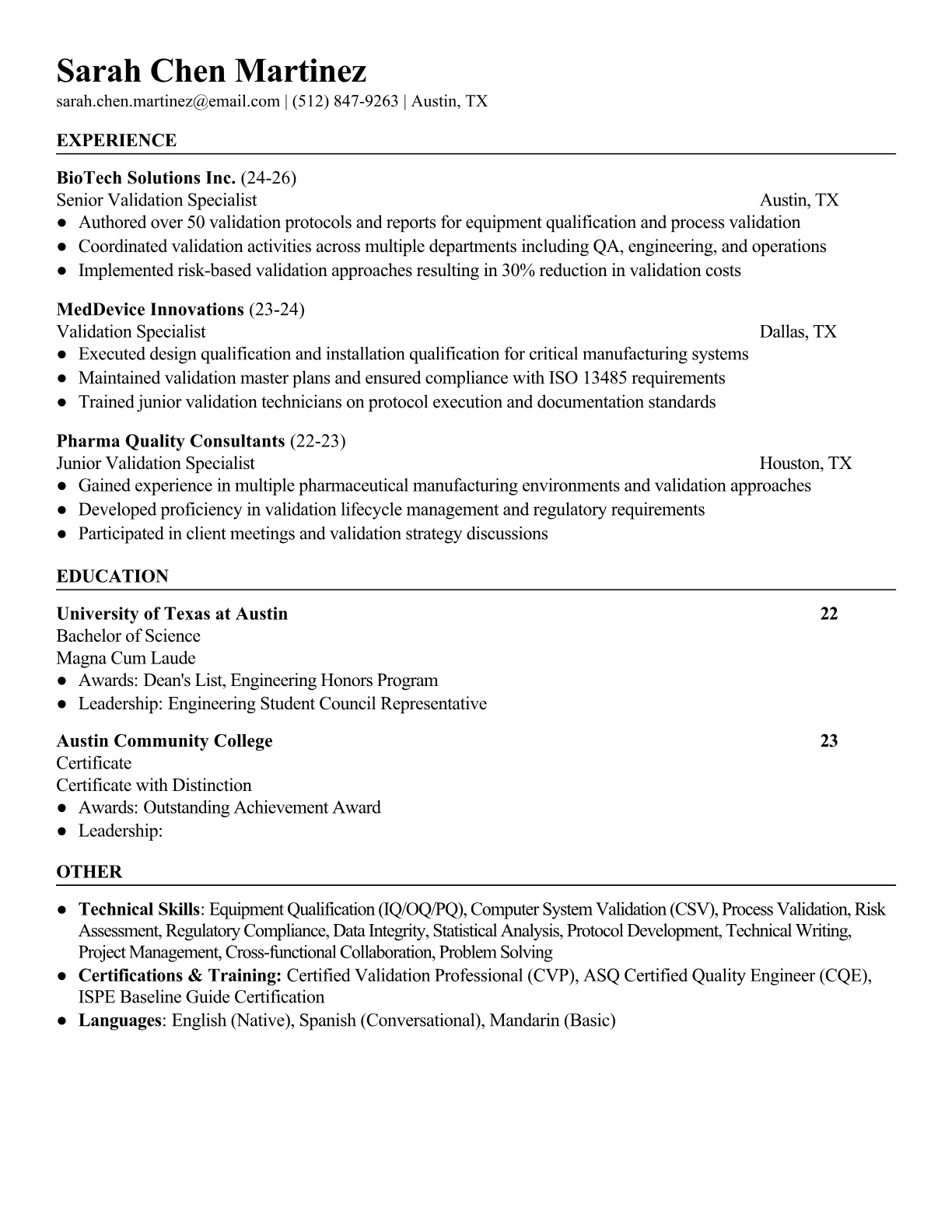 Professional Validation Specialist resume templates optimized for pharmaceutical, medical device, and regulated industries. Includes GMP, FDA, CSV, and regulatory compliance keywords for ATS systems.