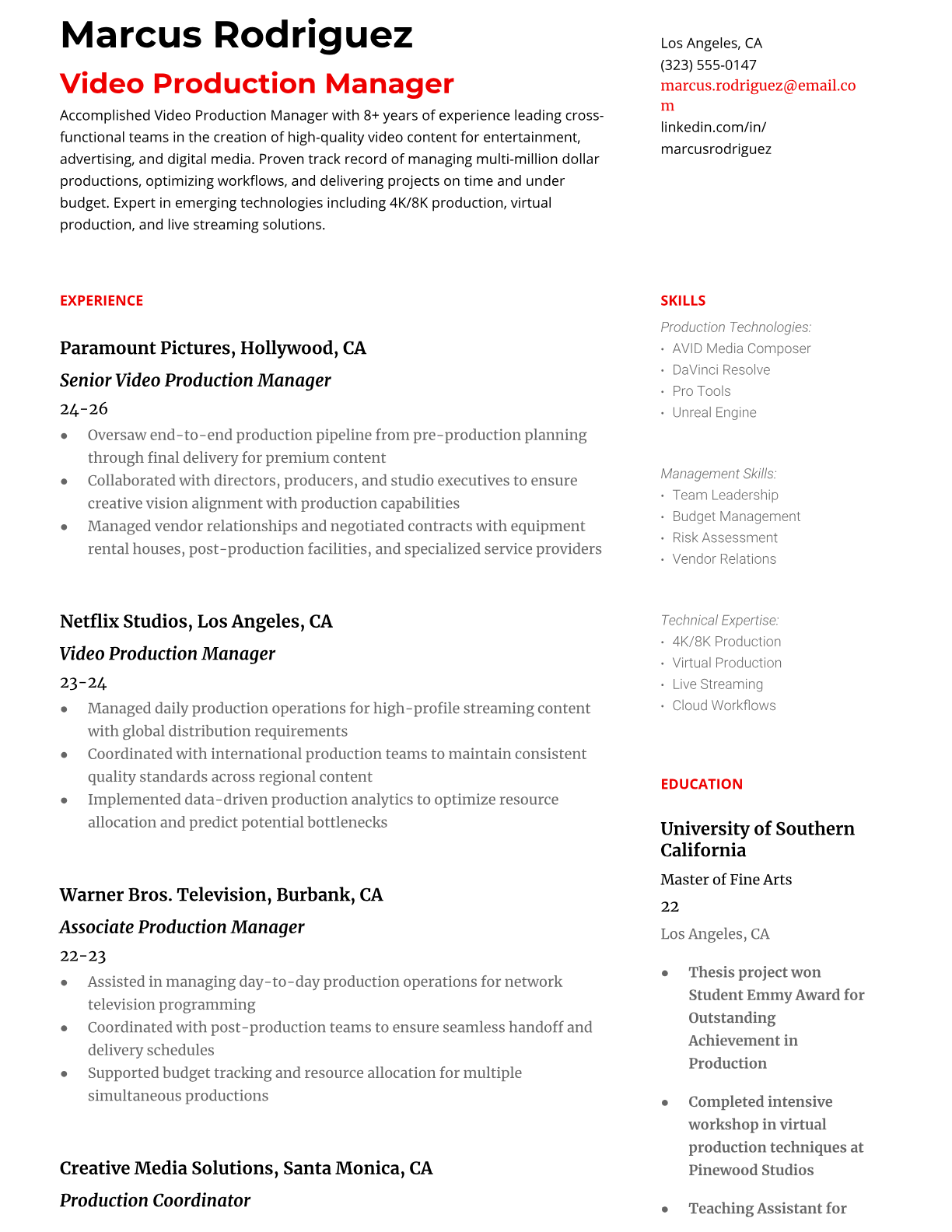 Video Production Manager Resume Templates - Creative & Professional Formats