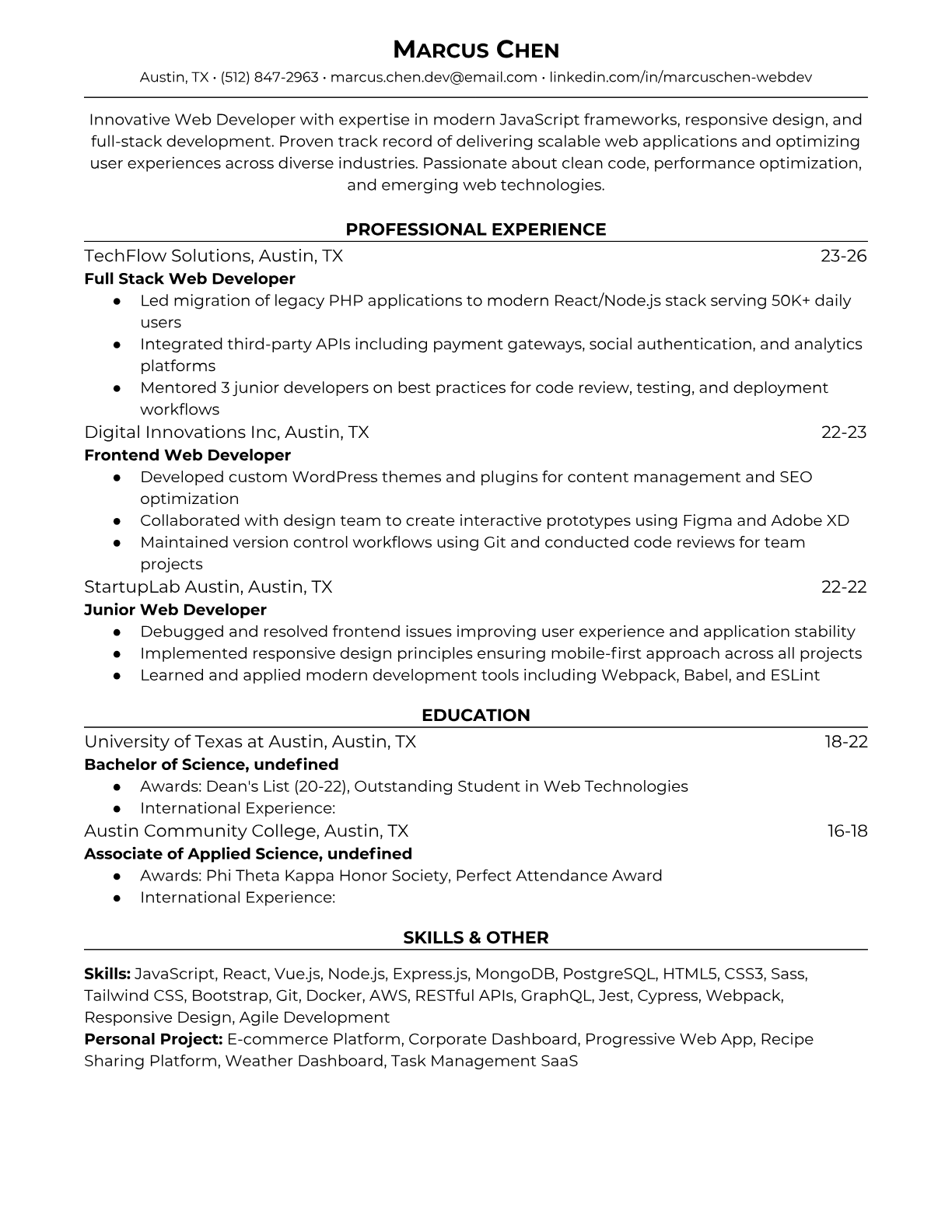 Professional web developer resume templates optimized for ATS systems. Highlight your JavaScript, React, and full-stack development skills with templates used by developers at top tech companies.