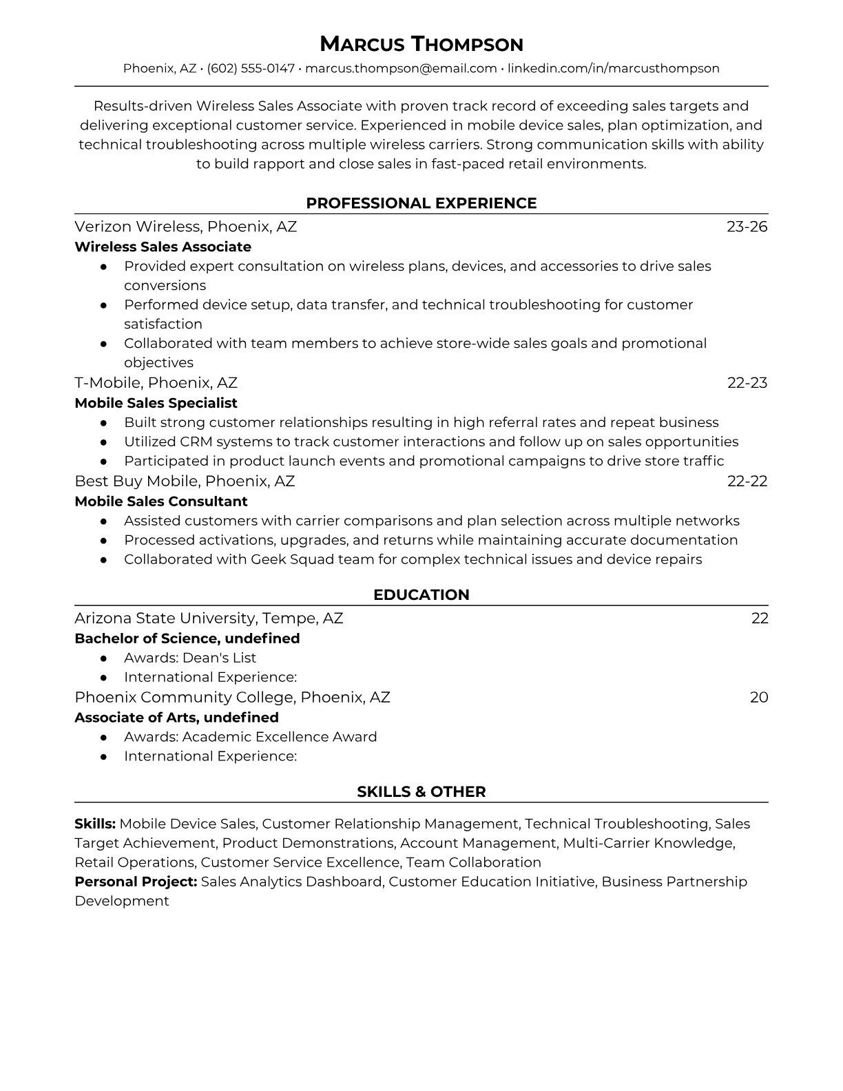 Professional Wireless Sales Associate resume templates optimized for retail and carrier ATS systems. Includes sales keywords, metrics formatting, and customer service highlights.