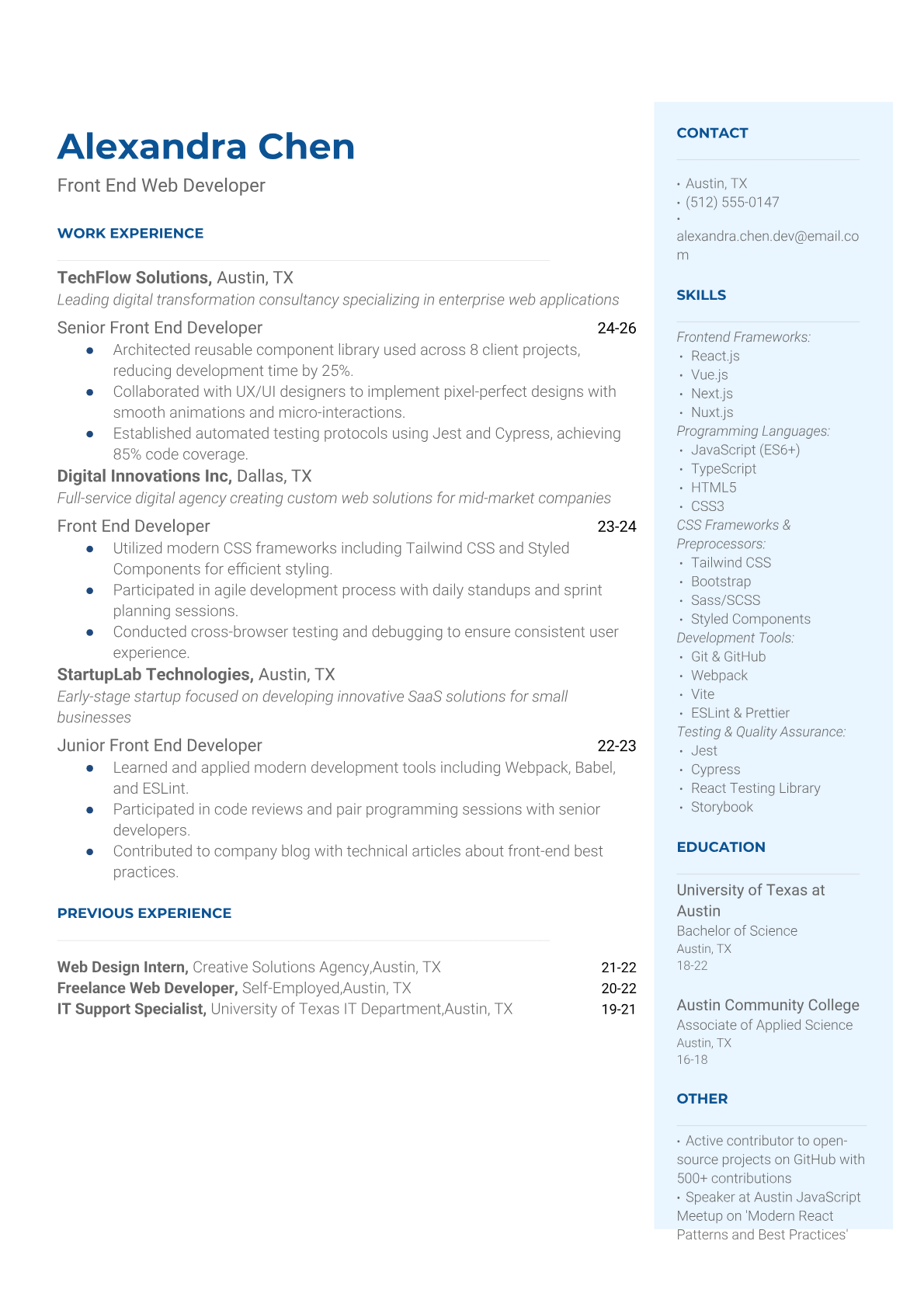 A Front End Web Developer creates user-facing web applications and interfaces using HTML, CSS, JavaScript, and modern frameworks like React, Vue, or Angular. They collaborate with designers and back-end developers to build responsive, interactive websites that provide excellent user experiences across different devices and browsers. The role requires strong technical skills in web technologies, version control, and often includes working with APIs and content management systems. An ATS-friendly resume is crucial for front-end developers because tech companies and agencies use automated screening to filter for specific programming languages, frameworks, and tools. Recruiters look for keywords like React, JavaScript, responsive design, and Git, so having these clearly structured in your resume ensures you pass the initial screening before human review.