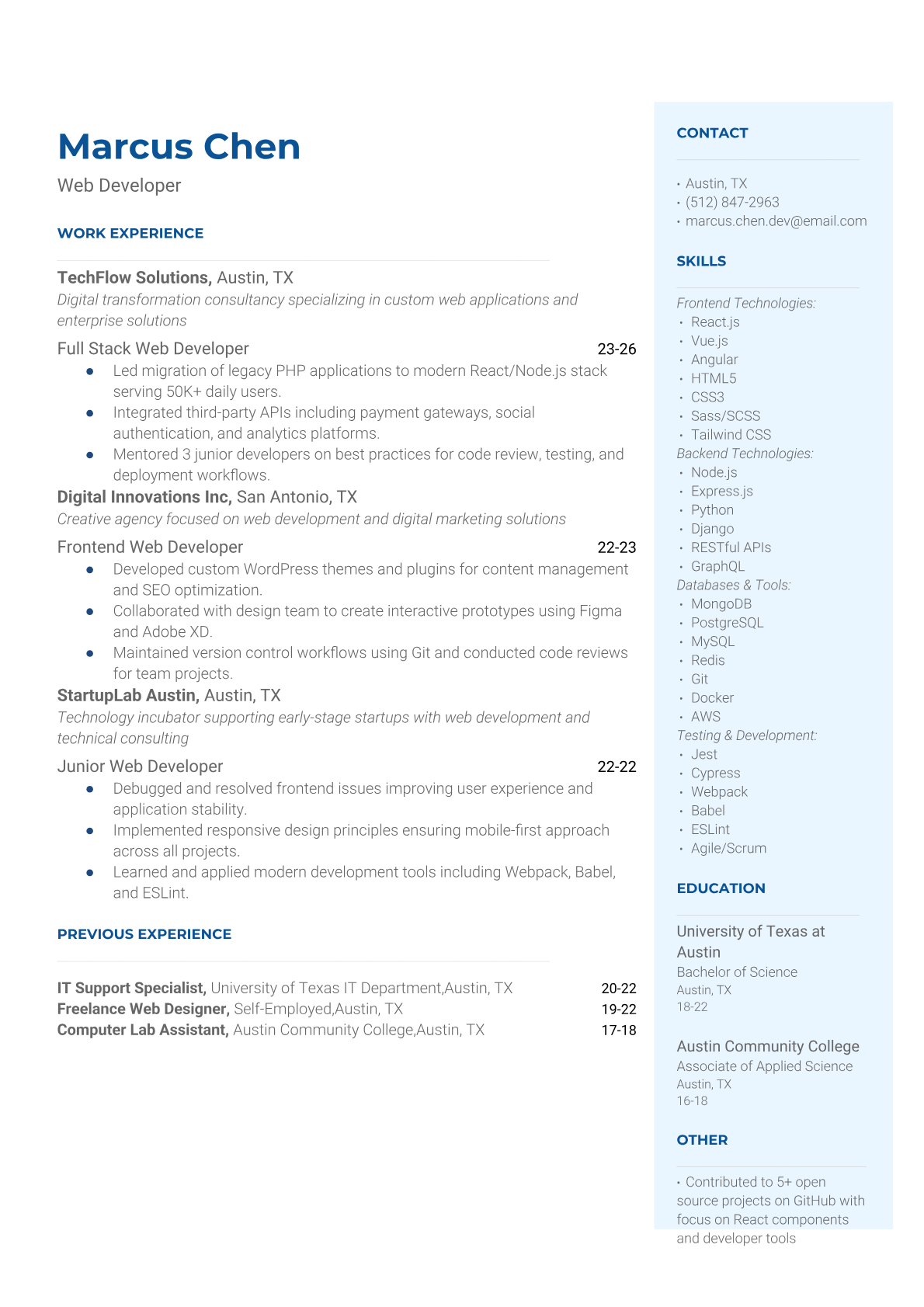 A Junior Web Developer builds and maintains websites and web applications using HTML, CSS, JavaScript, and modern frameworks like React or Vue.js. They work closely with senior developers and designers to implement user interfaces, debug code, and ensure responsive design across different devices and browsers. An ATS-friendly resume is crucial for junior web developers because tech companies heavily rely on automated screening to filter candidates based on programming languages, frameworks, and technical skills. Without proper keyword optimization and clear technical sections, qualified candidates often get filtered out before recruiters can assess their coding abilities and project experience.